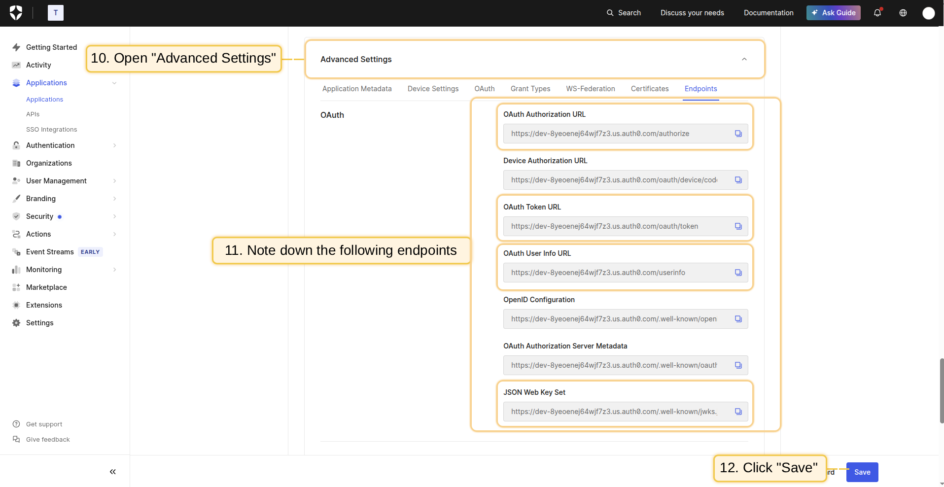 - 在Advanced Settings部分中,您将找到配置OAuth 2.0所需的所有URL(端点);