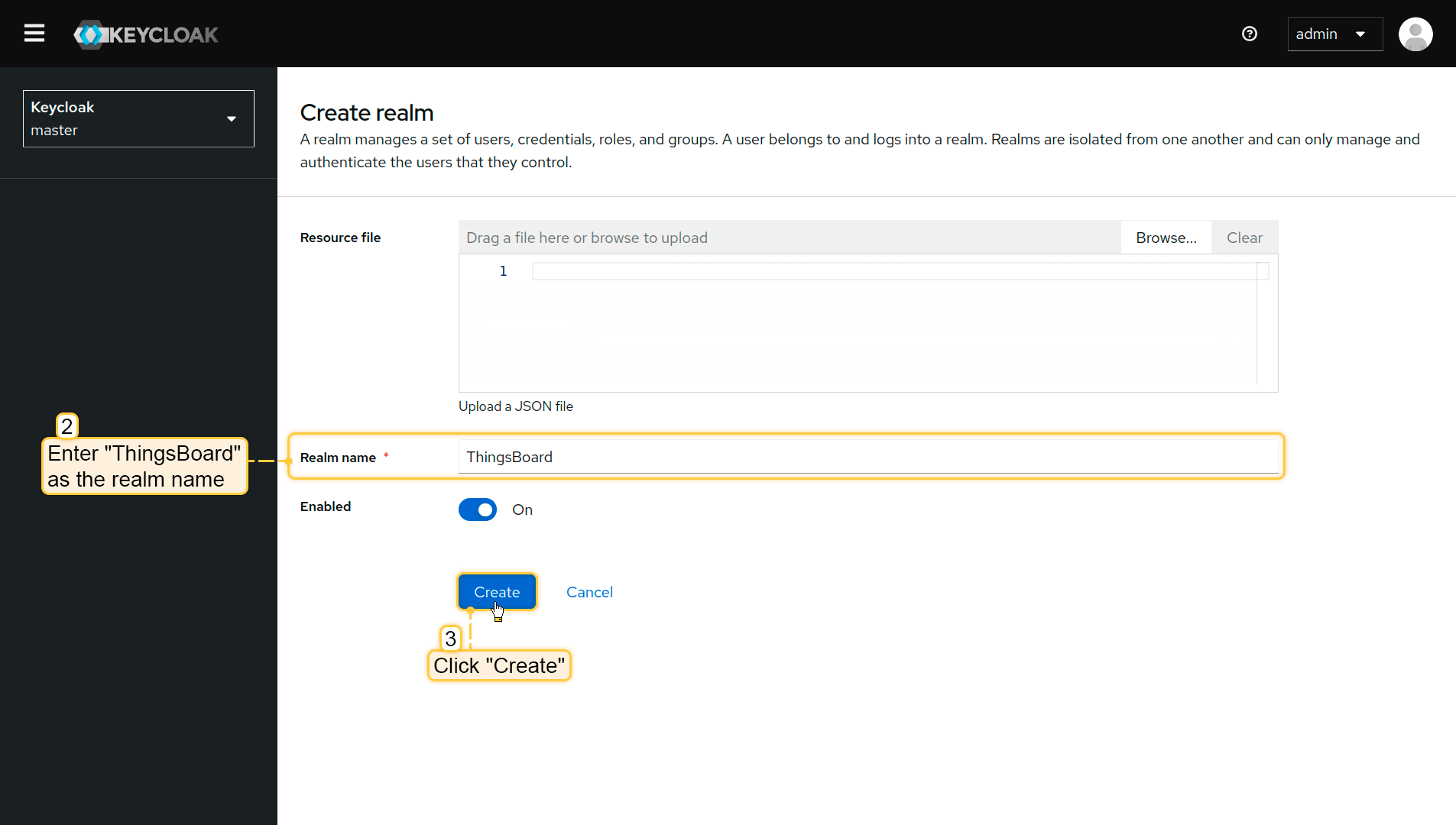 - 点击master领域旁的”Keycloak”,然后点击”Create realm”按钮;