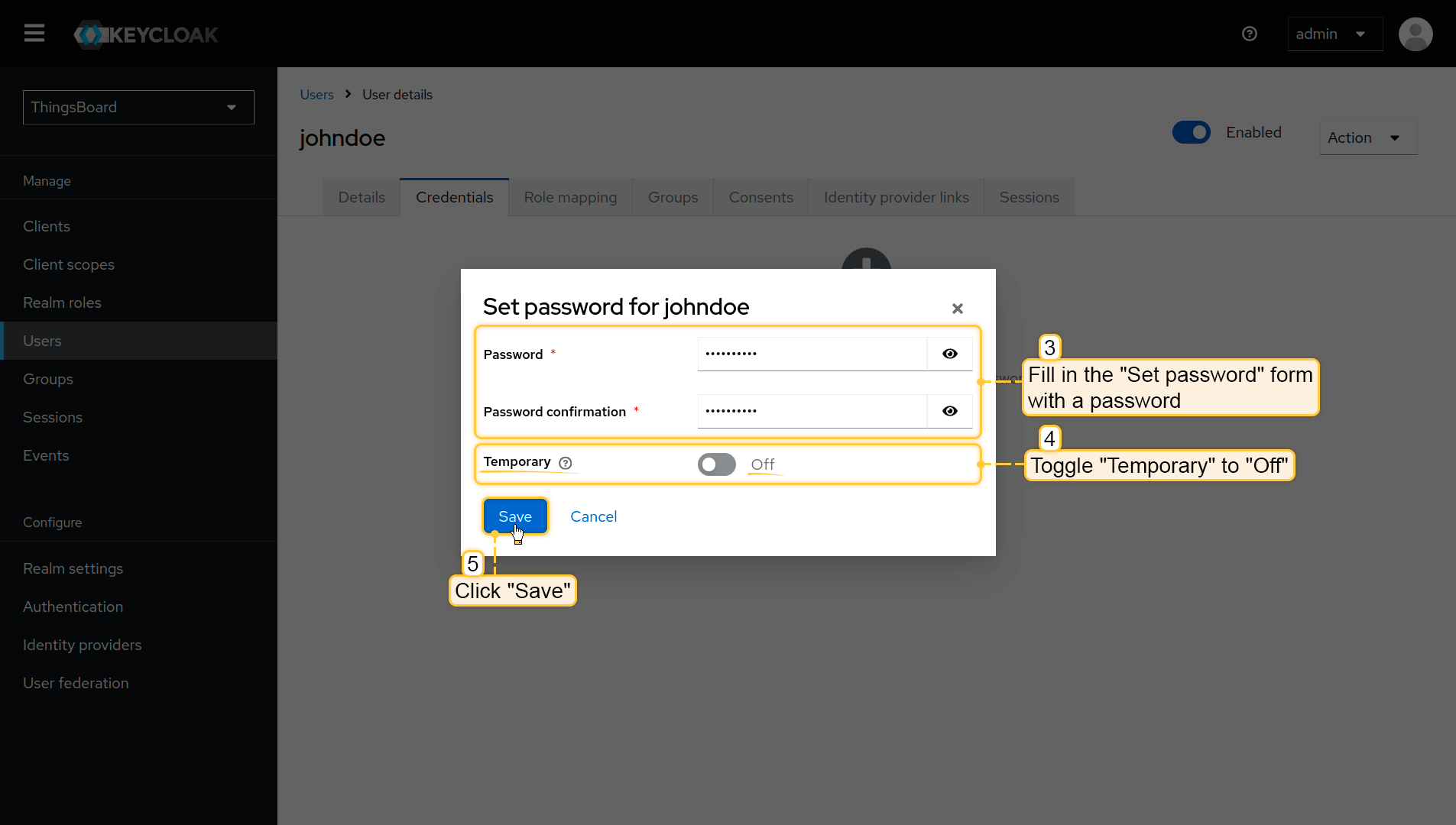 - 填写密码表单。将Temporary切换为Off,以便用户在首次登录时不被强制更改密码;