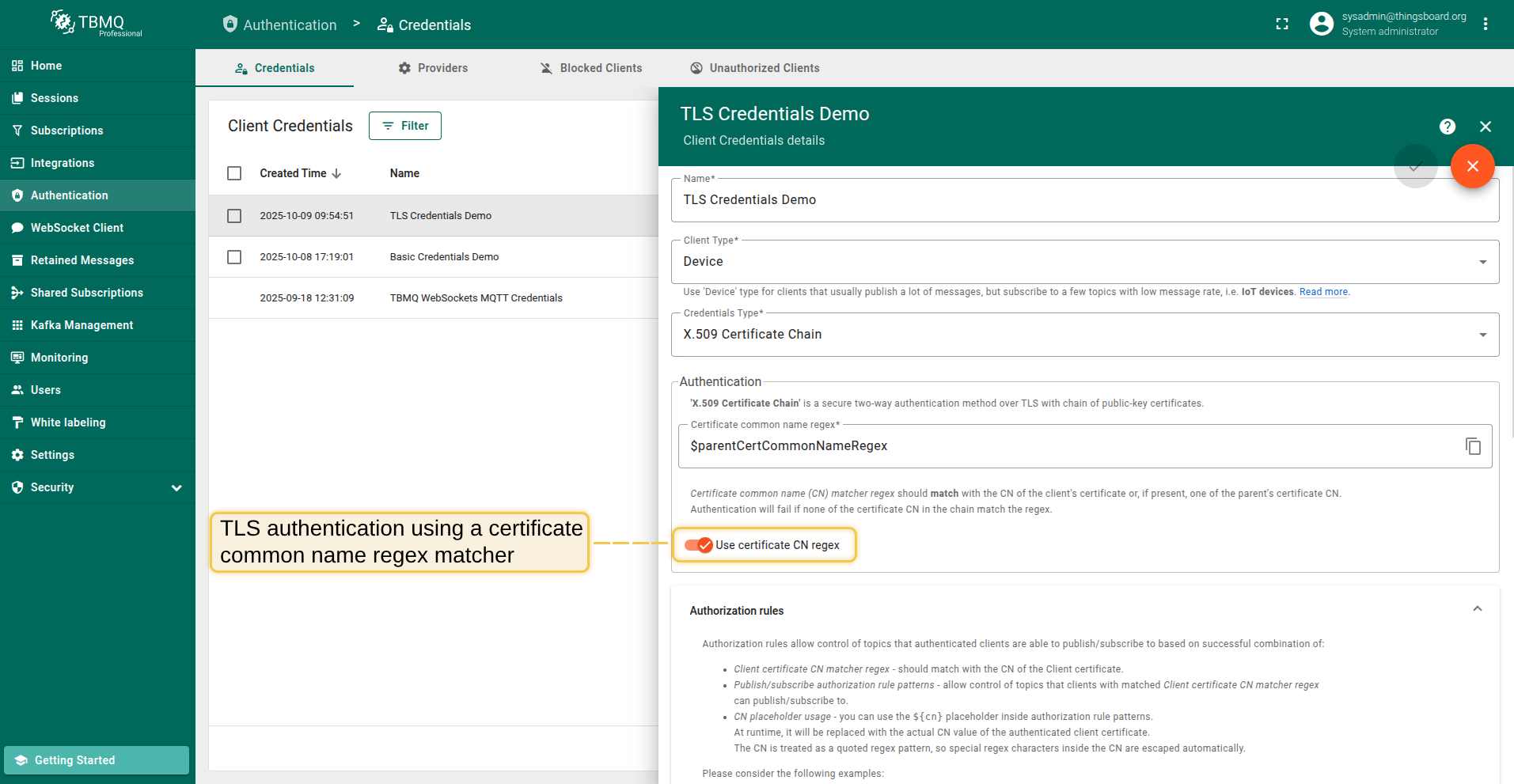 凭据中 “Use certificate CN regex” 参数支持两种认证选项。 根据该参数,TBMQ可使用证书的Common Name (CN) 精确匹配认证客户端,或使用特定正则匹配并授权客户端, 在客户端验证上提供灵活性。