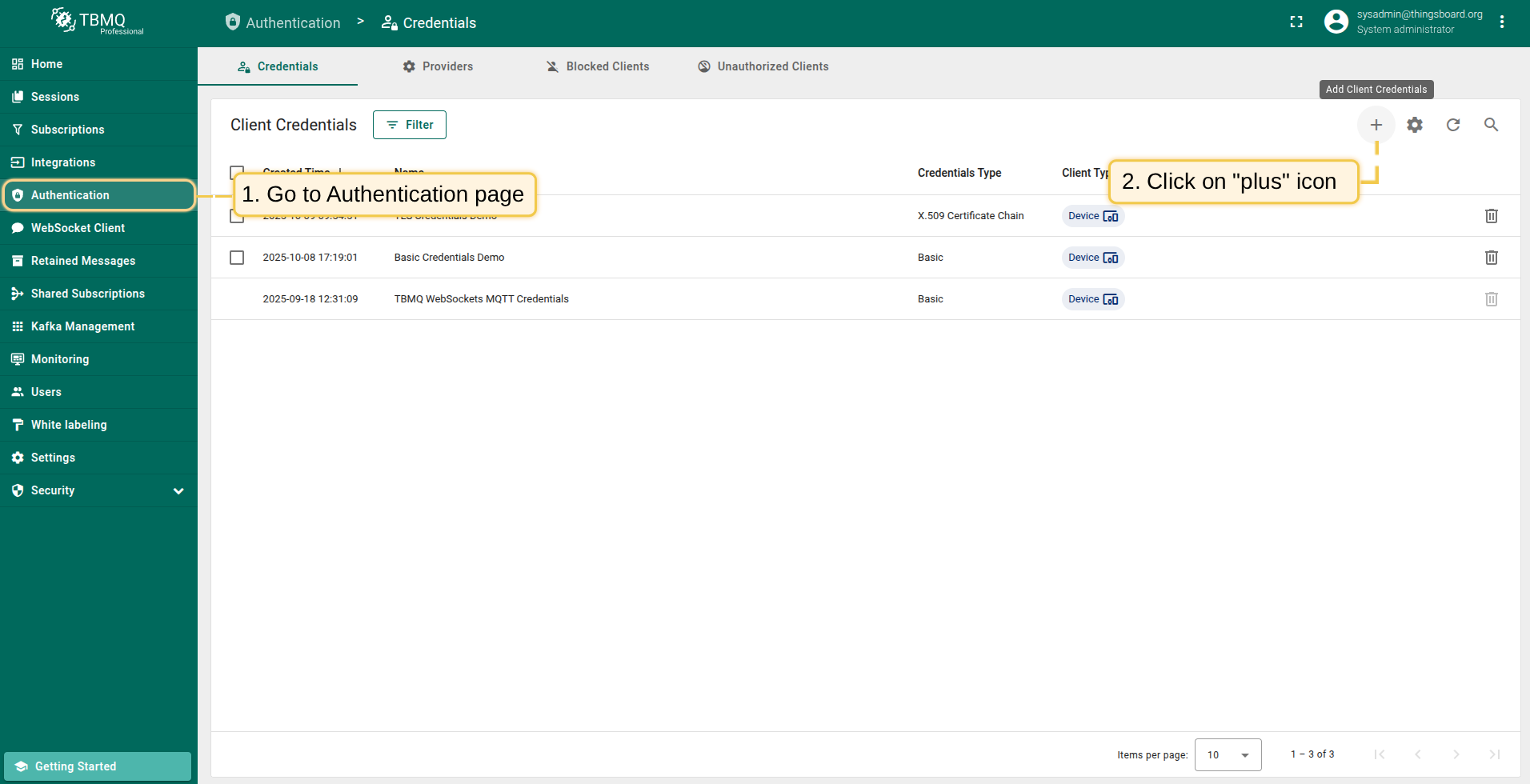 - 进入 Authentication-Credentials 页面,点击以加号图标表示的Add Client Credentials 按钮。