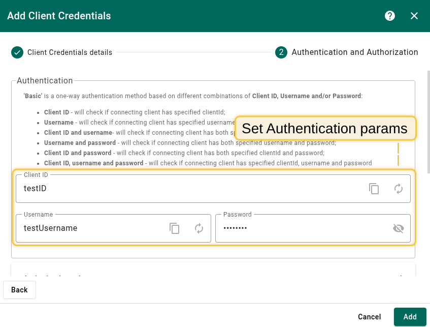 - 选择所需的 Credentials Type,并配置认证参数和授权规则。