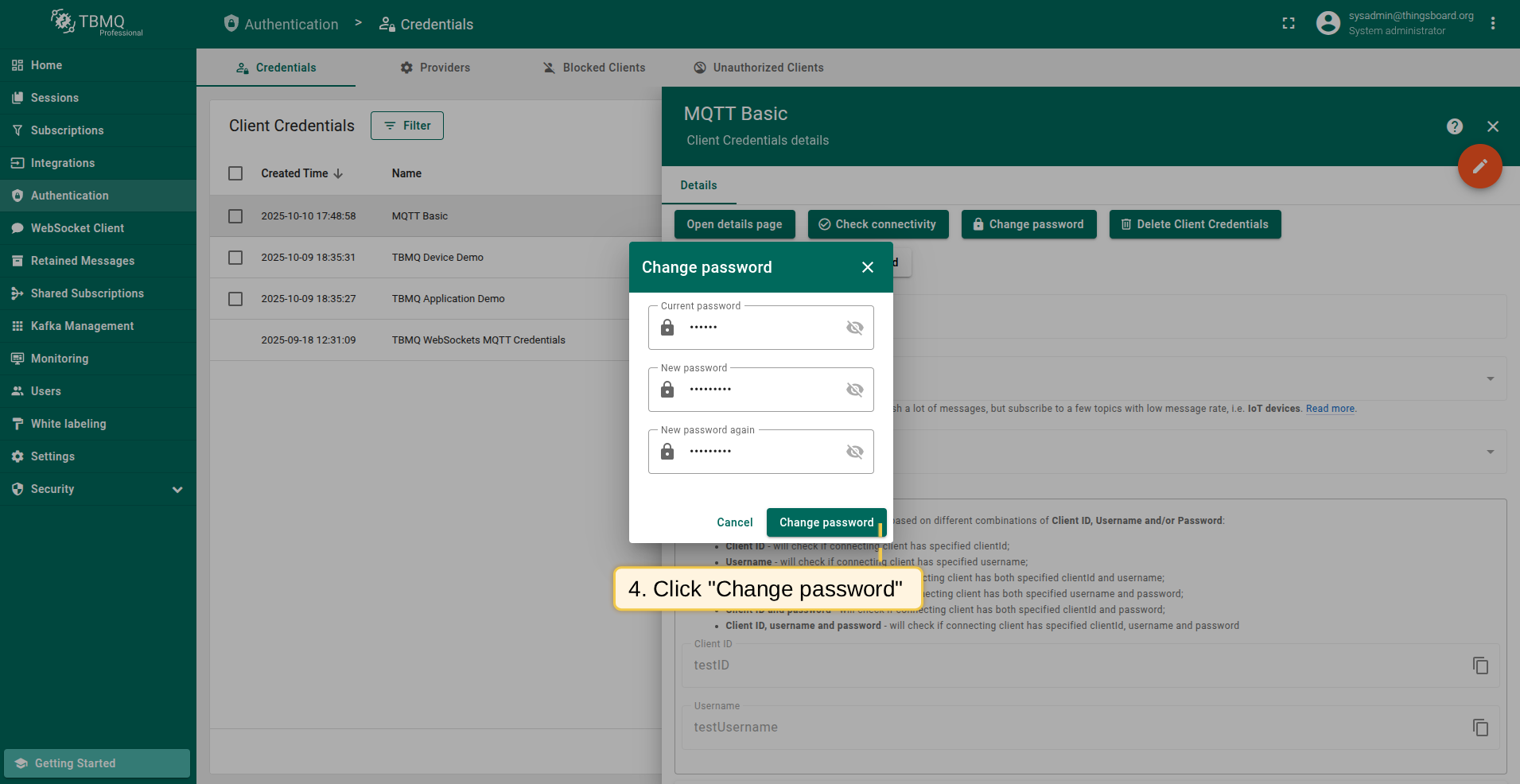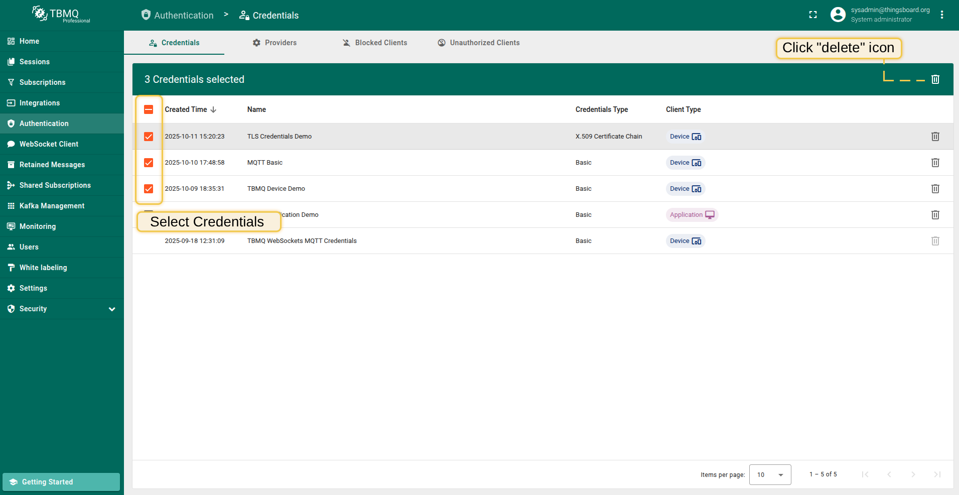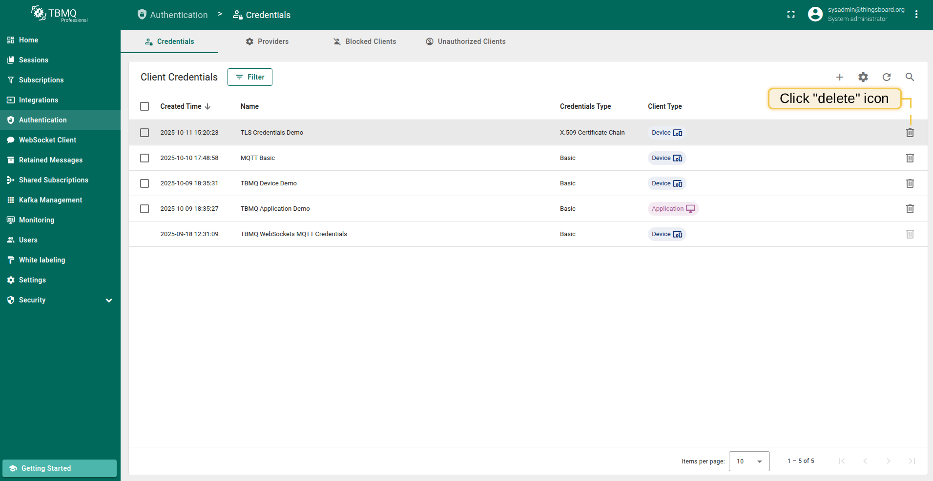 Broker管理员可通过Web UI或 REST API 从TBMQ系统中移除客户端凭据。