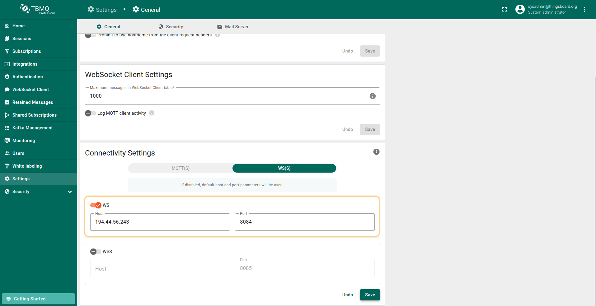 定义TBMQ UI中使用的全局MQTT连接设置(如默认主机和端口),并配置WebSocket客户端行为, 包括活动日志选项和浏览器内消息表的消息保留限制。