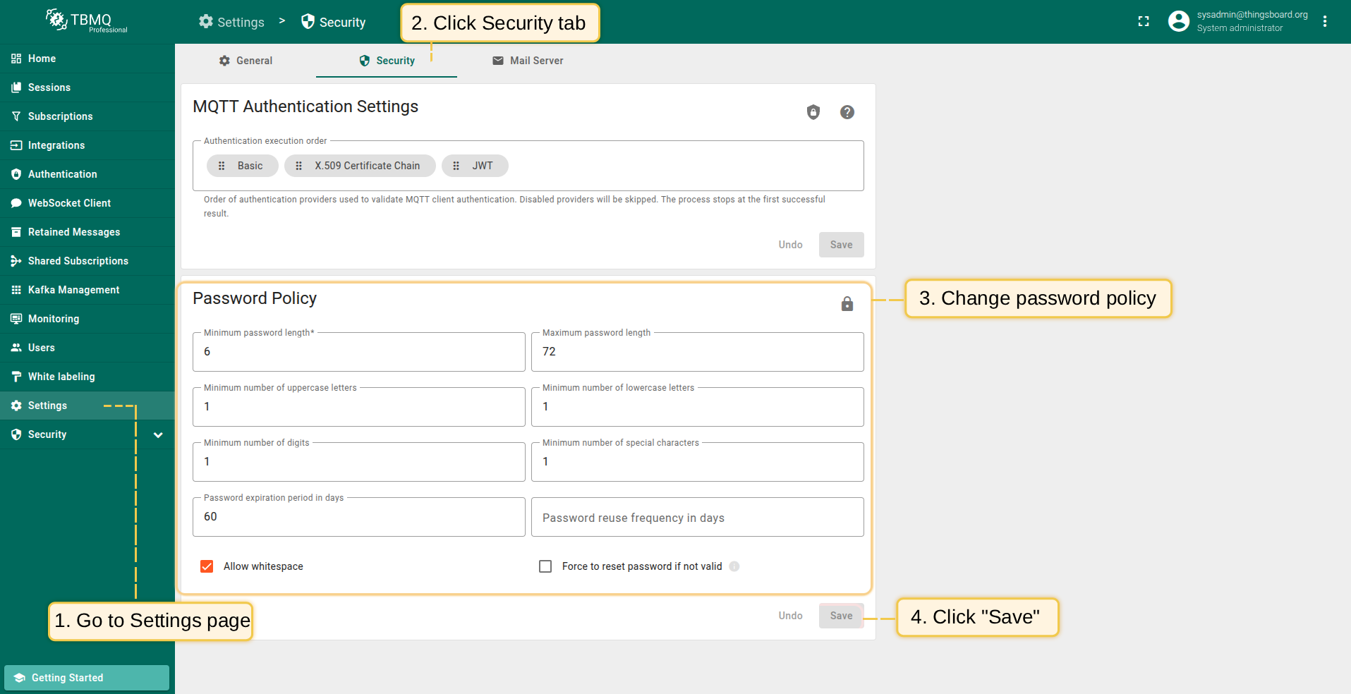 - Password expiration period in days - 强制密码过期。过期后TBMQ将要求用户修改密码,确保用户定期更新。