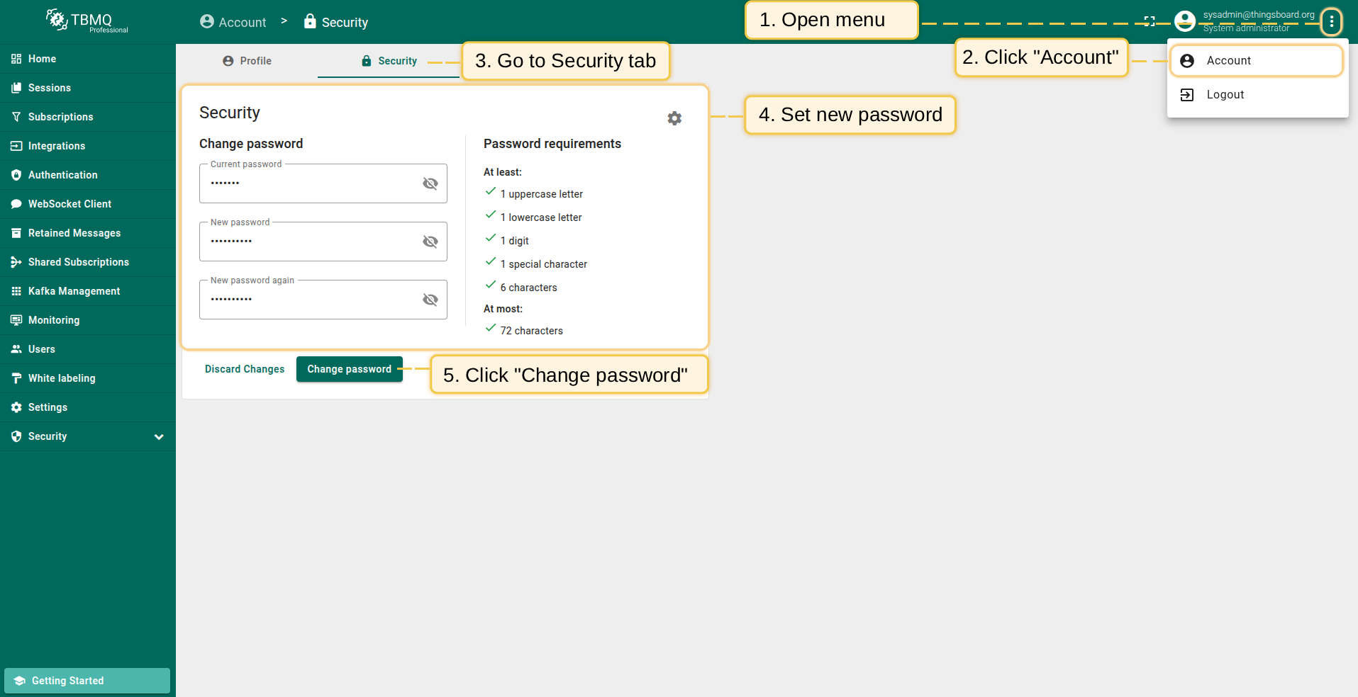 登录TBMQ时,用户使用邮箱和密码。 您可通过更新安全设置(包括密码策略)来提高账户安全性。