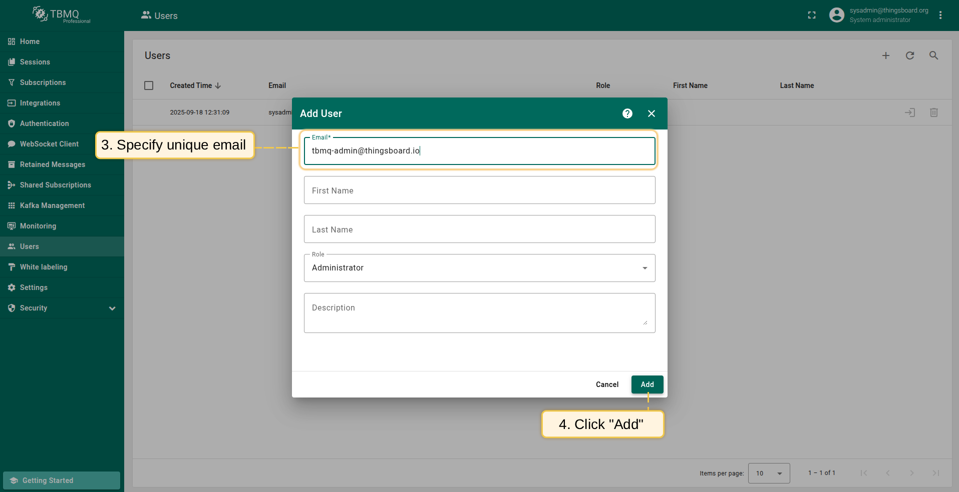 - 填写用户邮箱(系统内必须唯一),名、姓和描述为可选。点击 Add 创建用户。