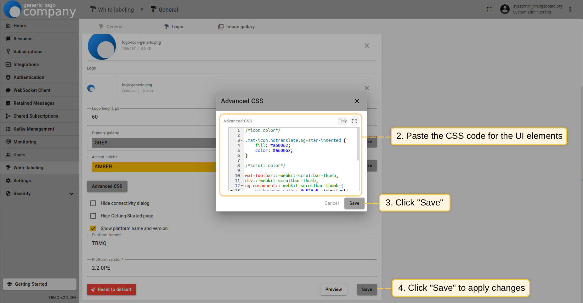- Paste the CSS code with the style for the user interface into the "Advanced CSS" pop-up window and click "Save". Then save all changes;