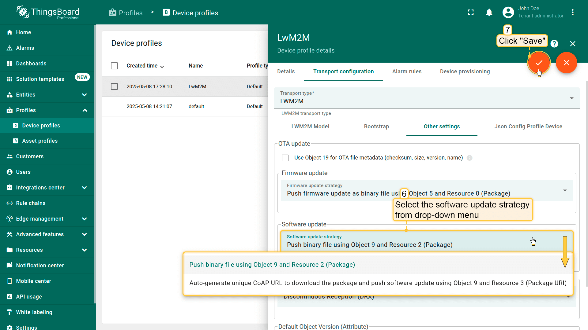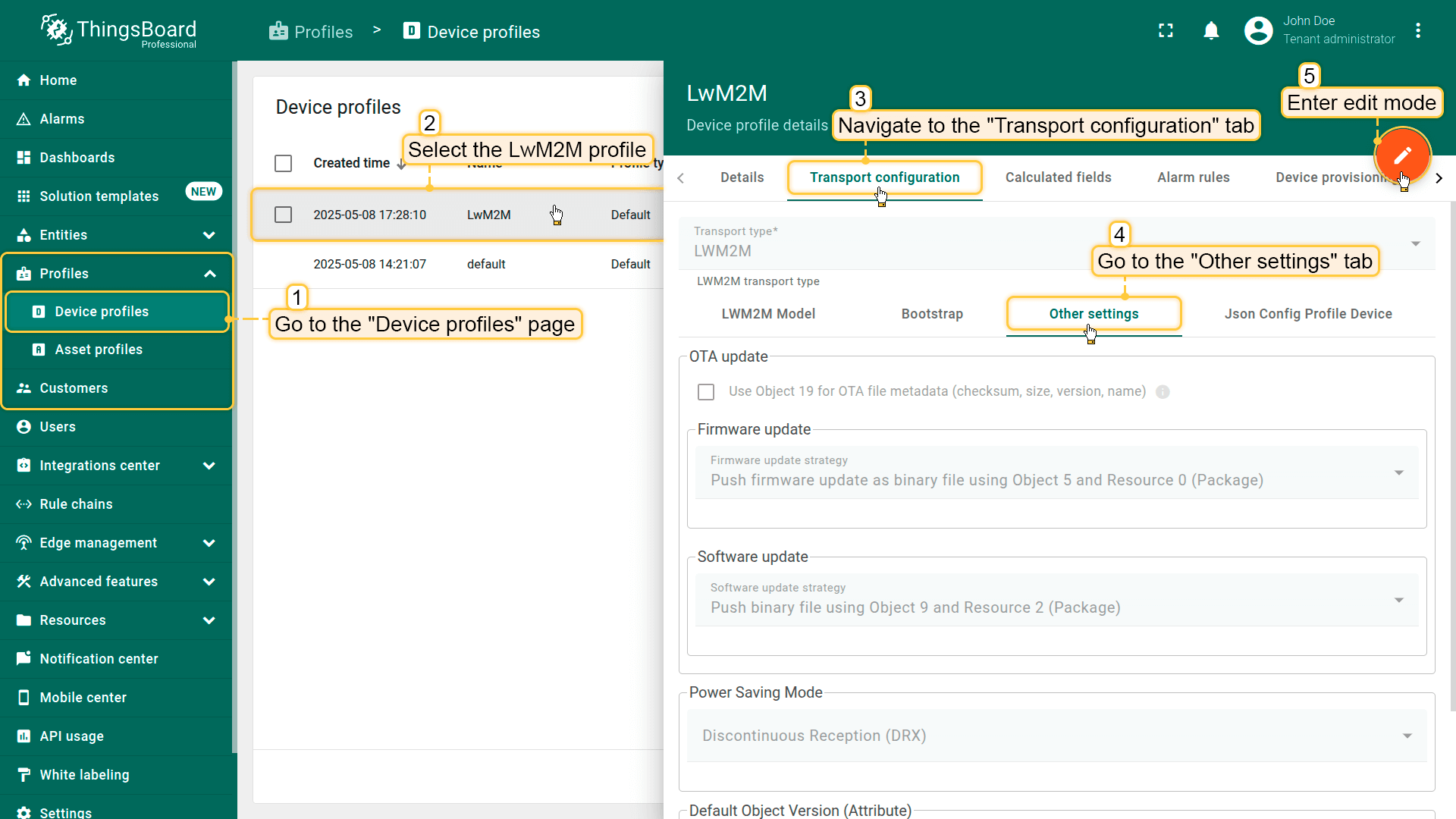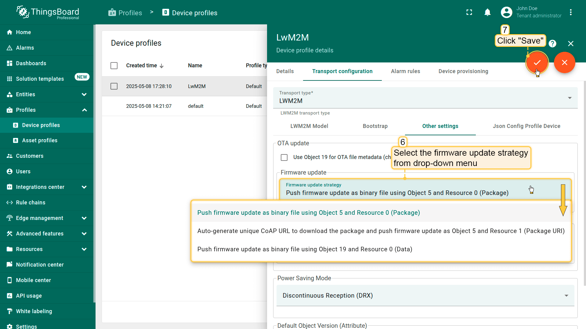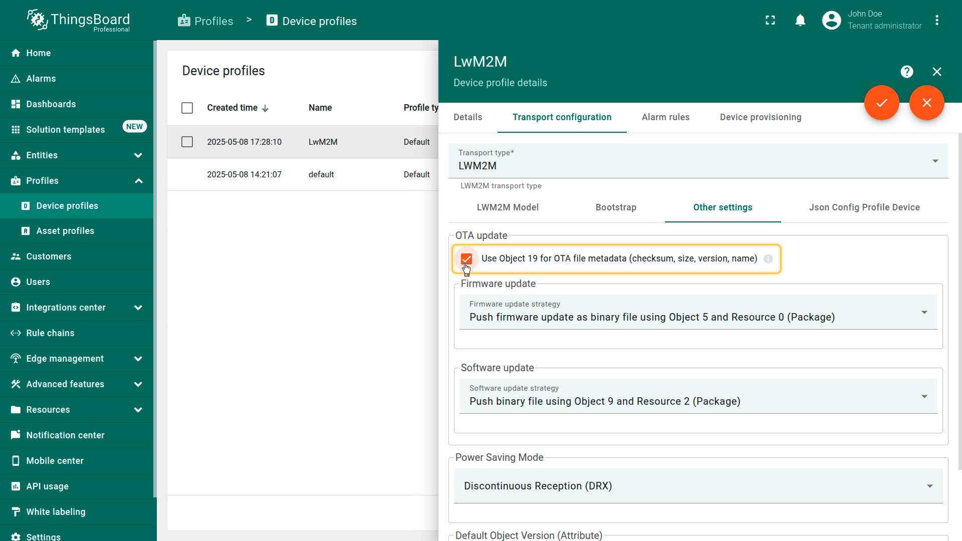 上传LwM2M模型后,可以用它们来配置LwM2M设备的设备配置文件。 关于设备配置文件的一般信息,请参阅此处。