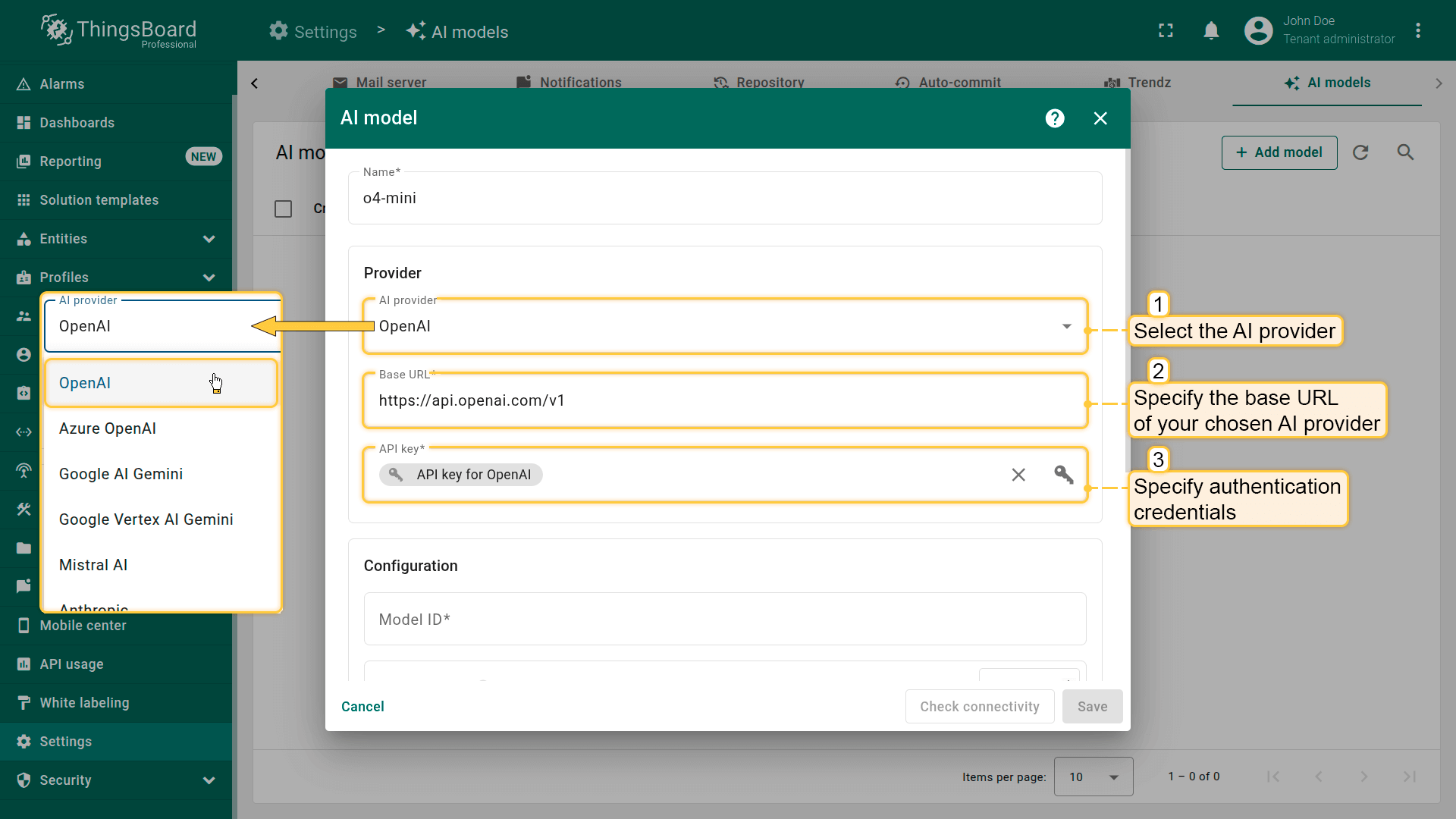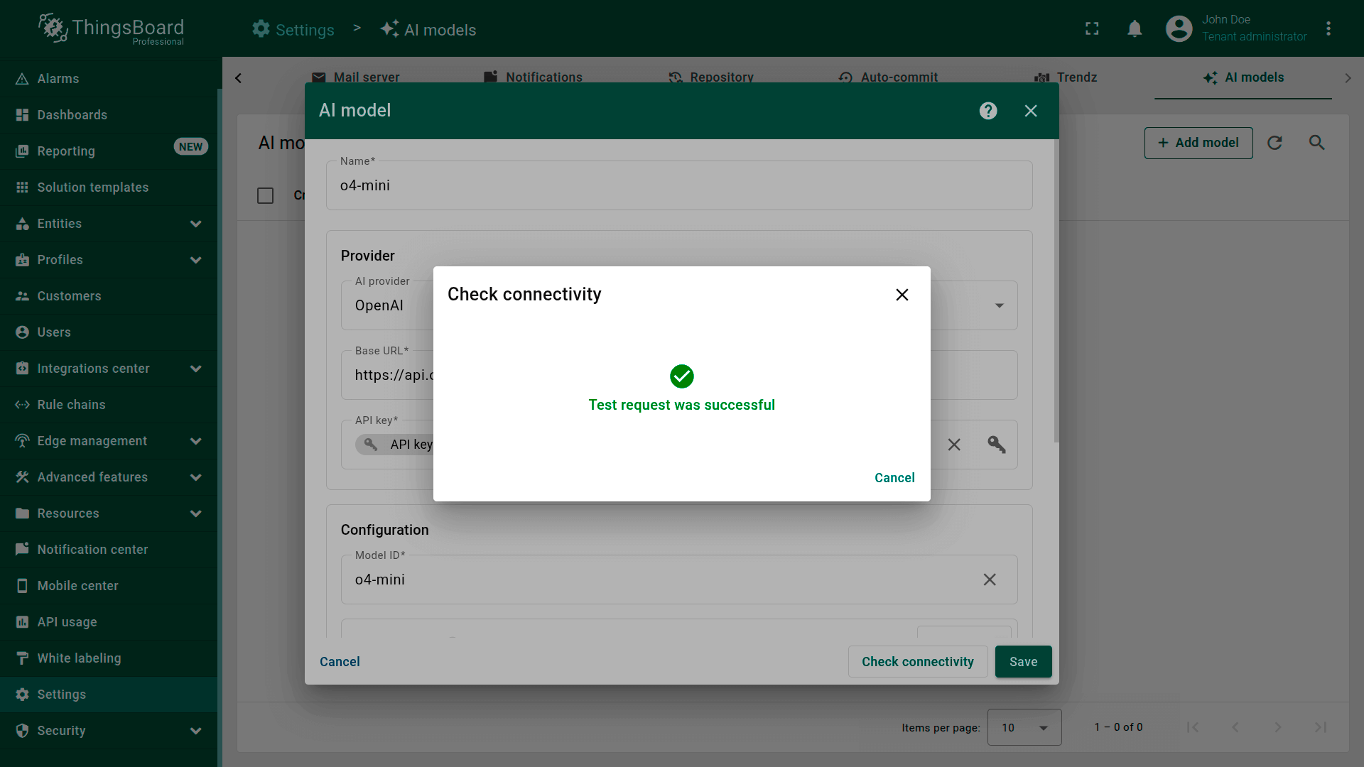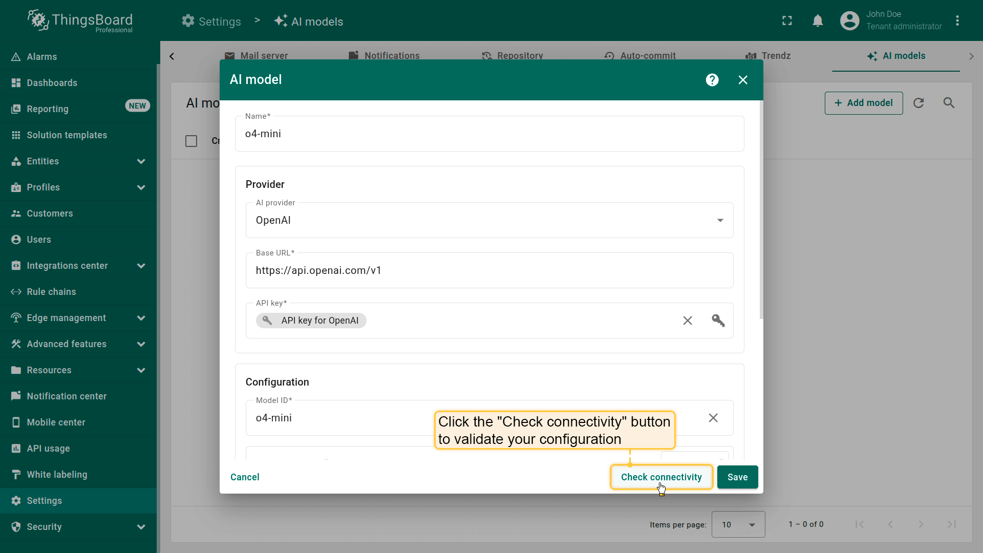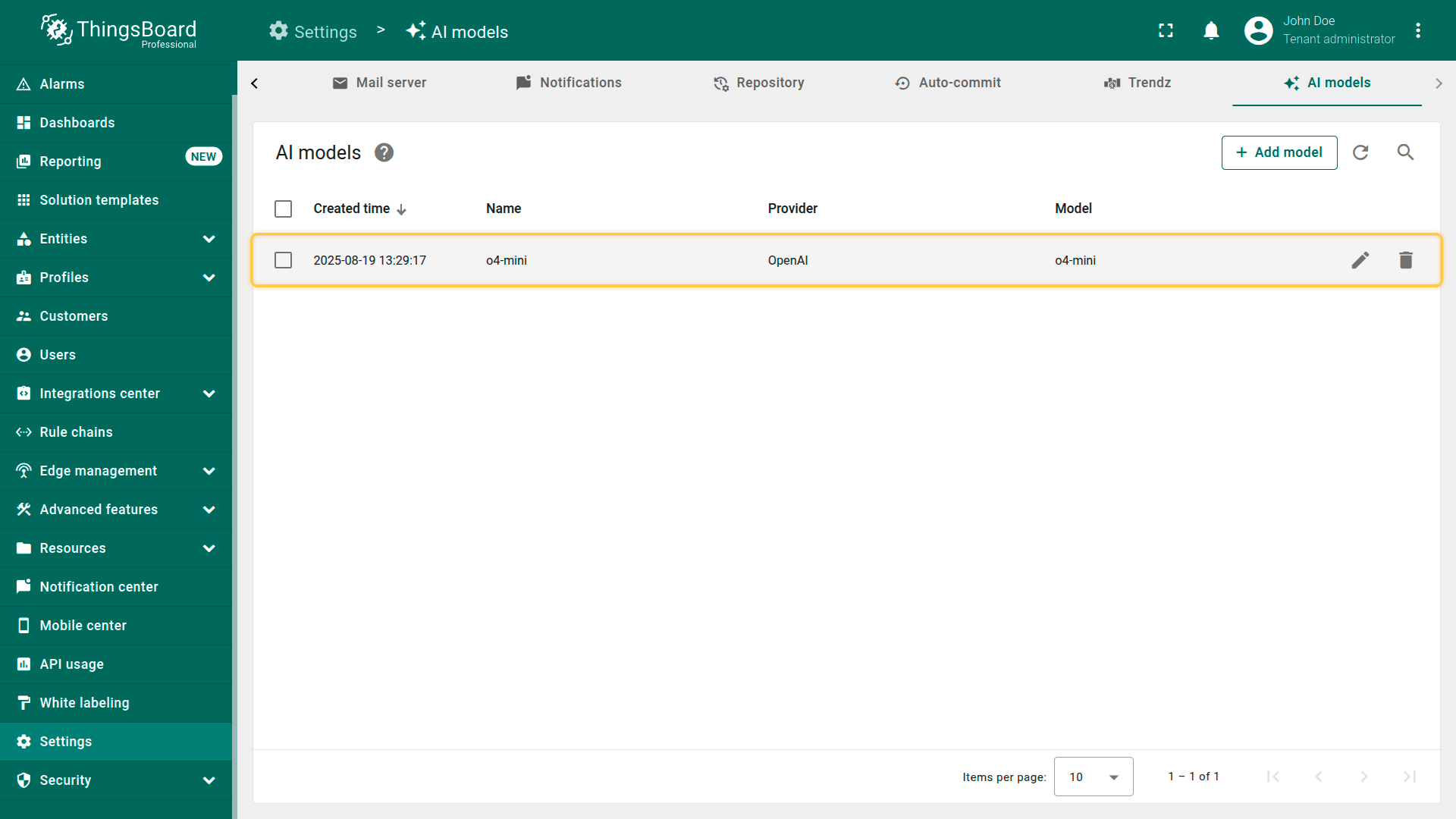 ThingsBoard允许您配置并连接不同的AI提供方、管理模型设置,并在Rule Engine中用于自动化与决策。