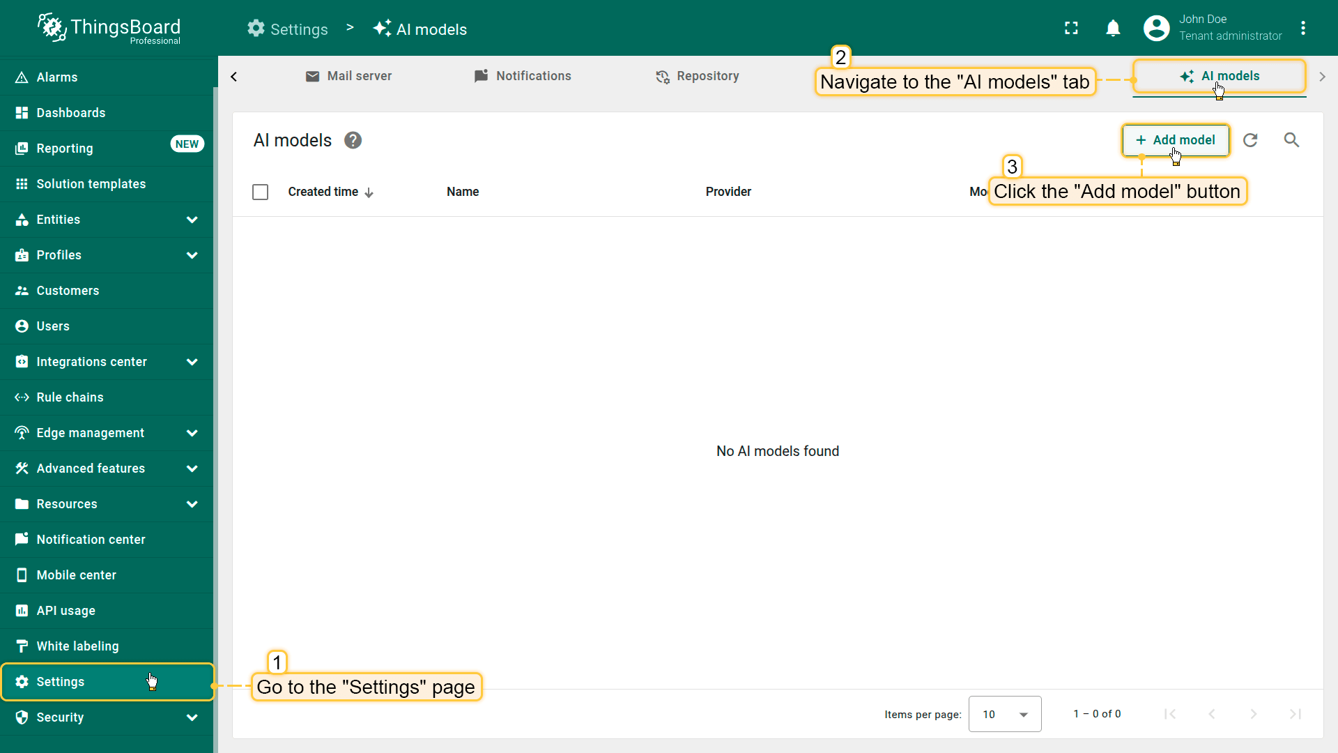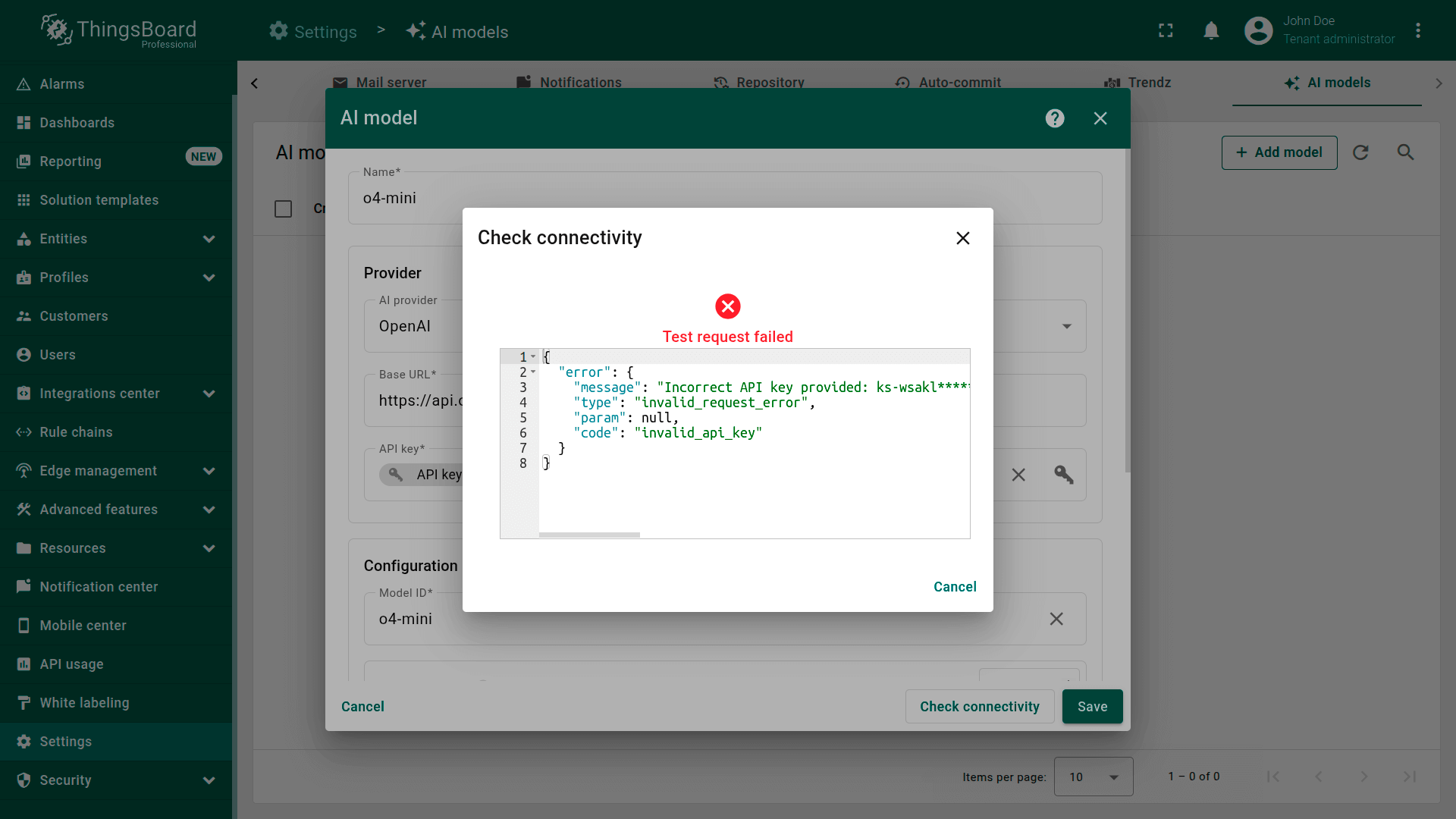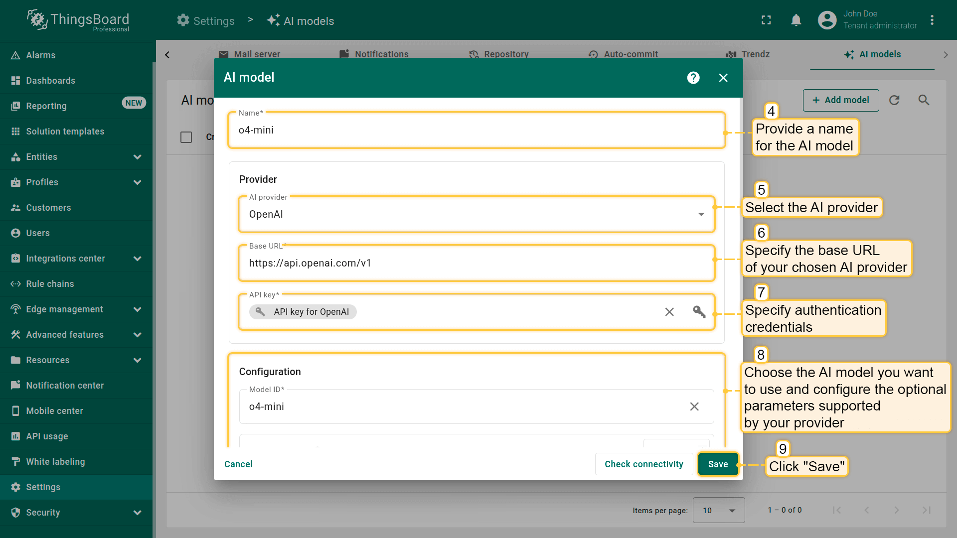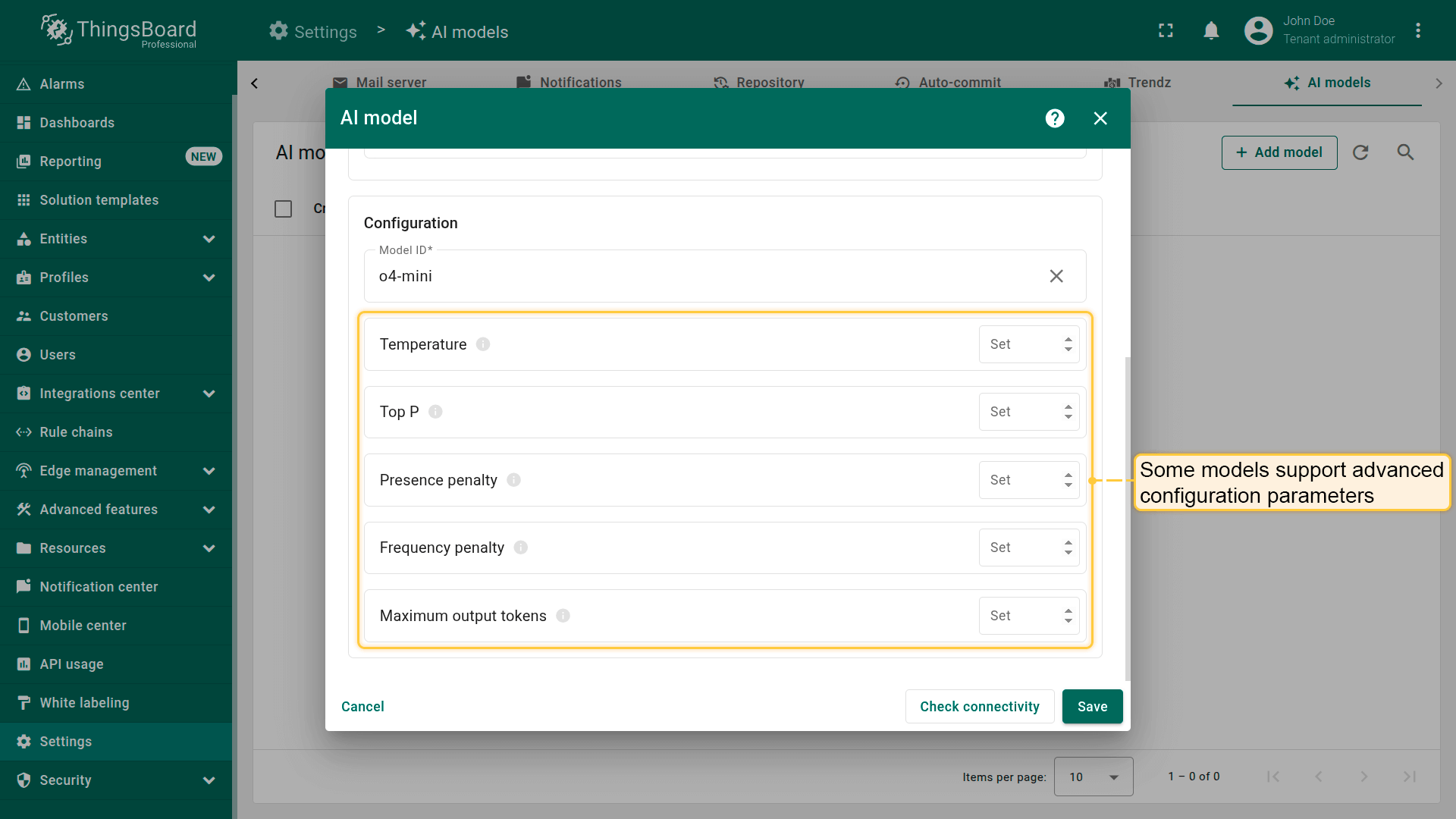 ThingsBoard允许您配置并连接不同的AI提供方、管理模型设置,并在Rule Engine中用于自动化与决策。