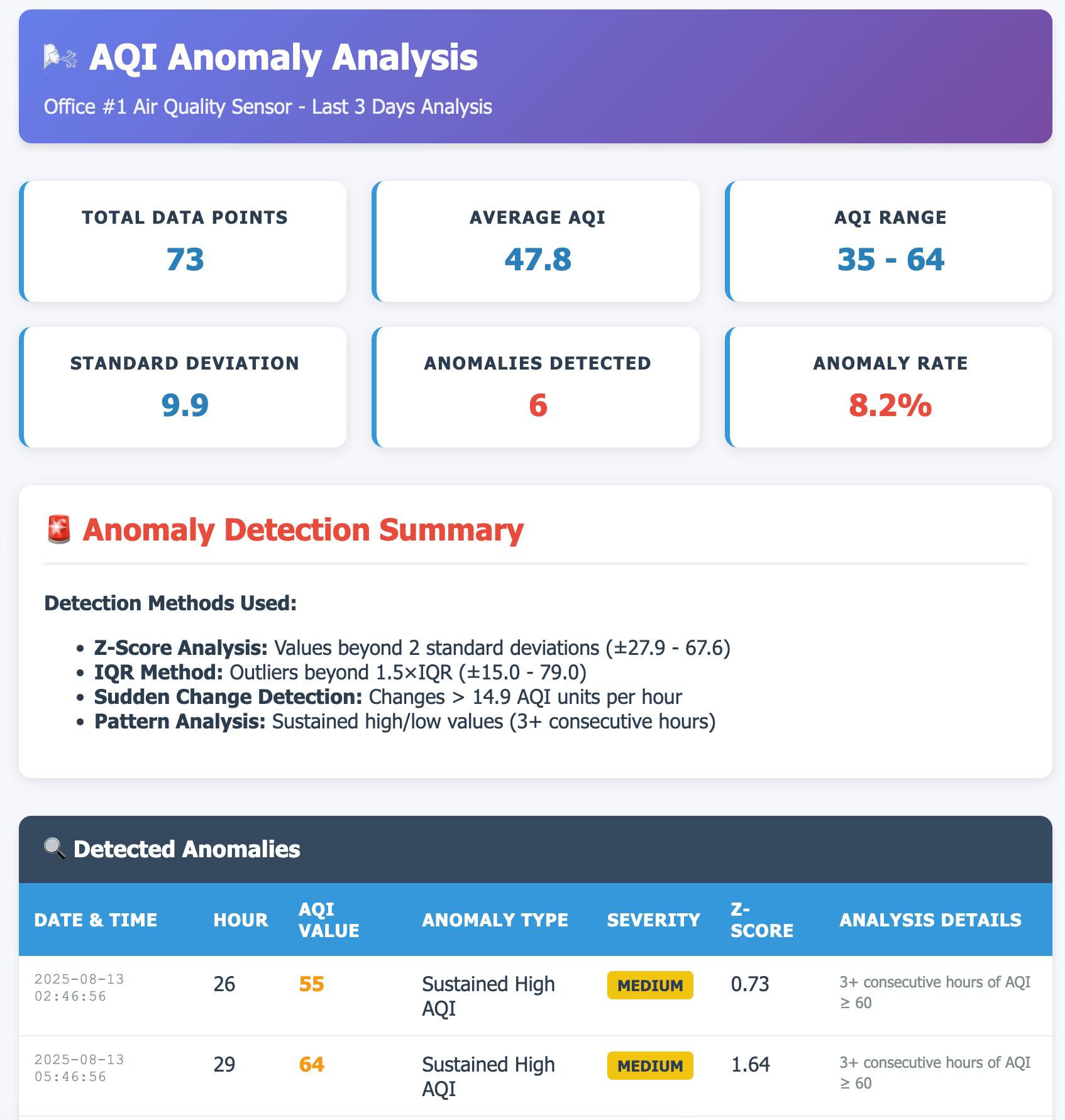 Analyze AQI of Office #1 AQI Sensor for anomalies in the last 3 days and show results in a table.