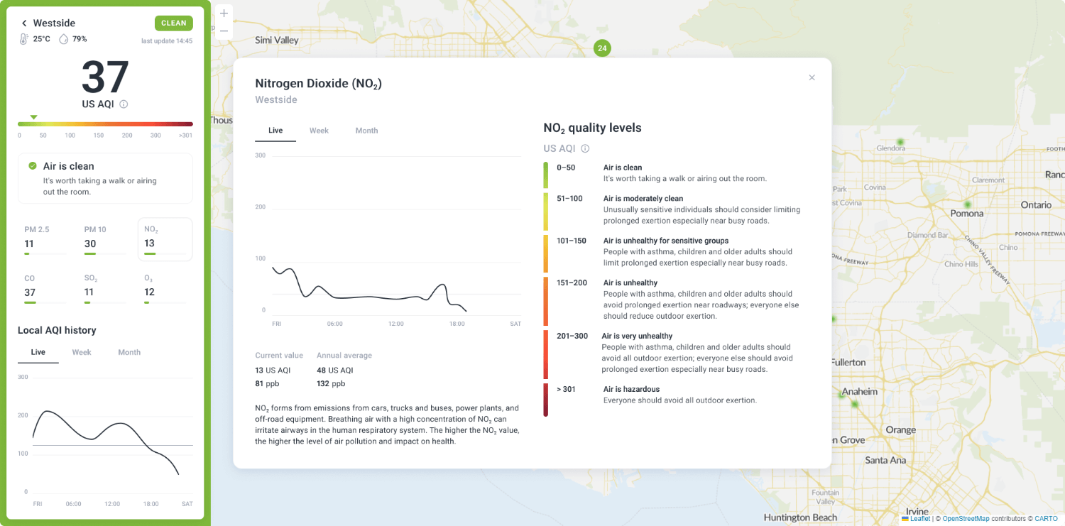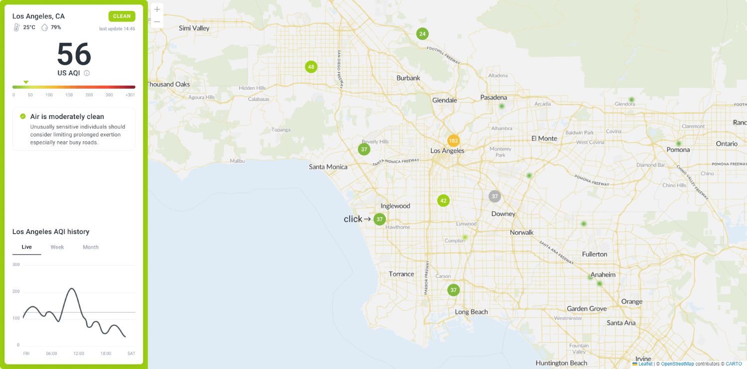 • 使用带按AQI等级着色的标记的空气质量监测站交互地图;