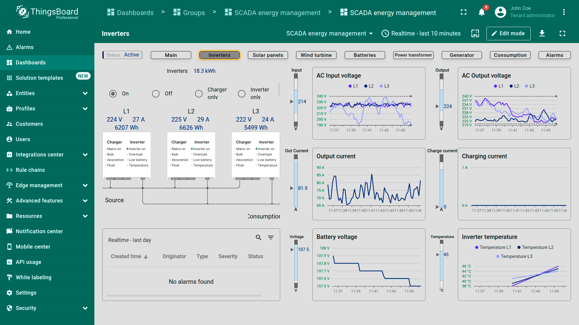 Inverters. Focuses on inverter performance and load distribution. Displays voltage, current, and power output for each phase (L1, L2, L3), with real-time graphs and an alarm section for issues like overload or overheating.