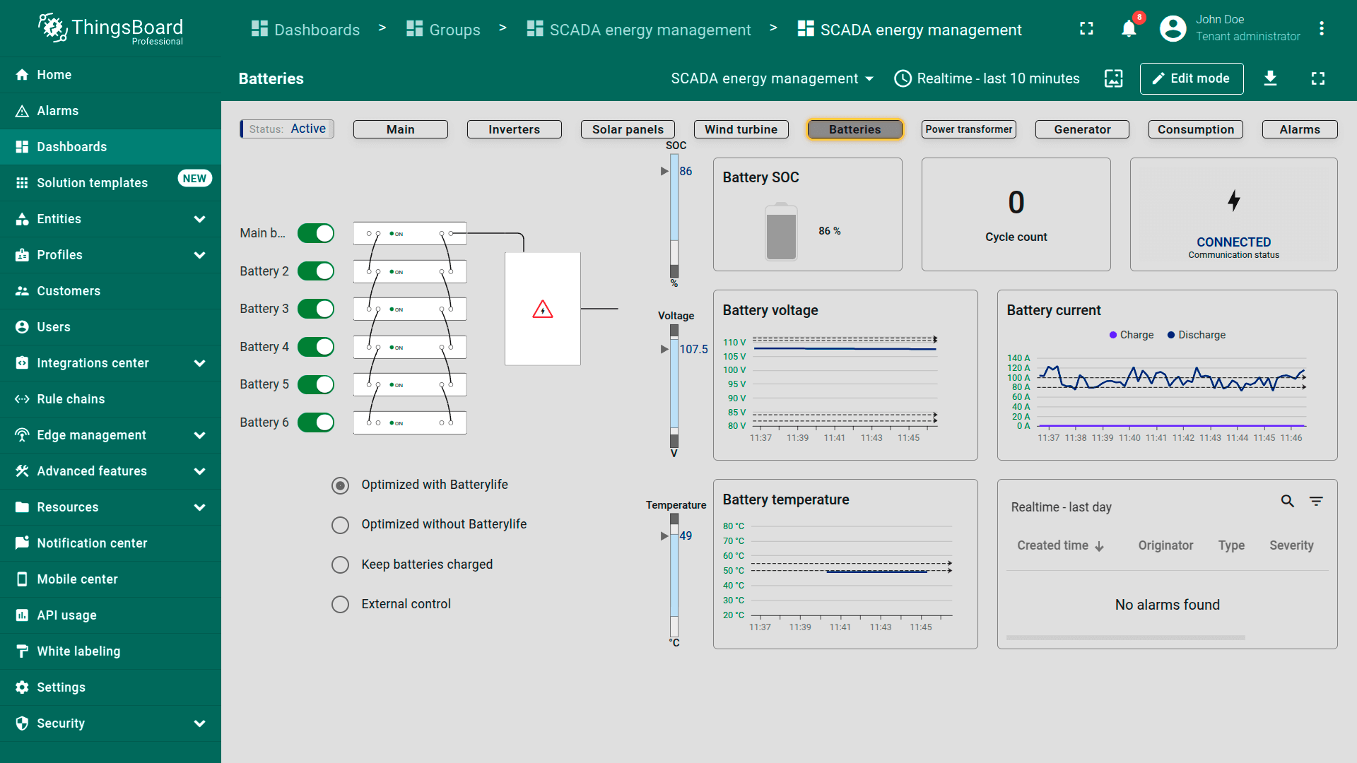Batteries. Shows battery storage status including charge level (SOC), cycle count, and voltage. Graphs track charging/discharging currents, temperature, and voltage trends. The alarm section highlights battery health or operation problems.