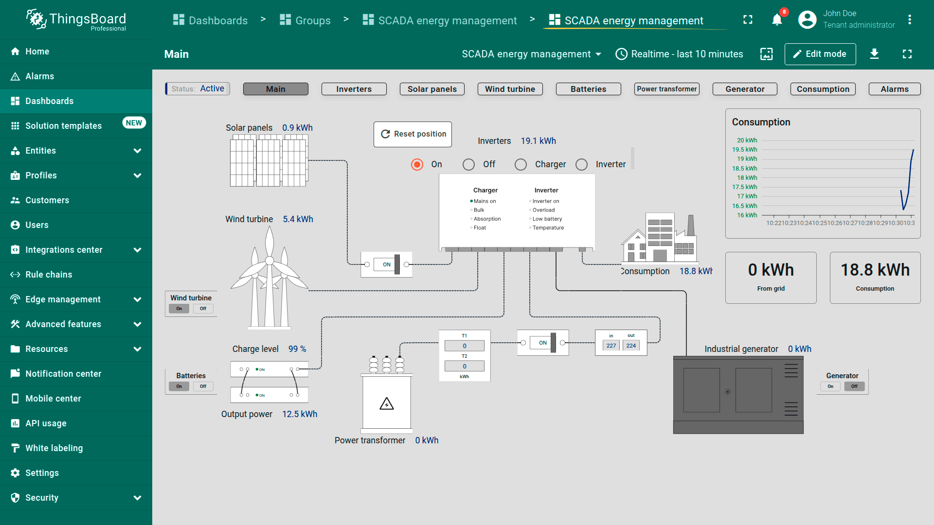 Main dashboard state. Provides a high-level overview of the energy system. Shows the status of power sources (solar, wind, batteries, transformers, generators), real-time energy flow, and consumption. Key metrics like grid input, power usage, and battery levels are displayed with interactive controls to manage sources.