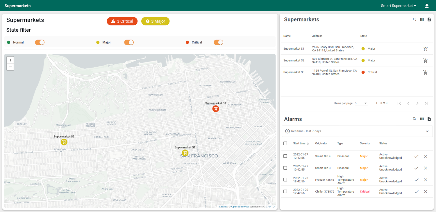 Supermarket management状态用于在零售公司(customer)范围内管理超市。该仪表板状态在地图上显示超市并在表格中列出超市。 超市为可包含多台设备及若干属性(平面图、地址)的资产。