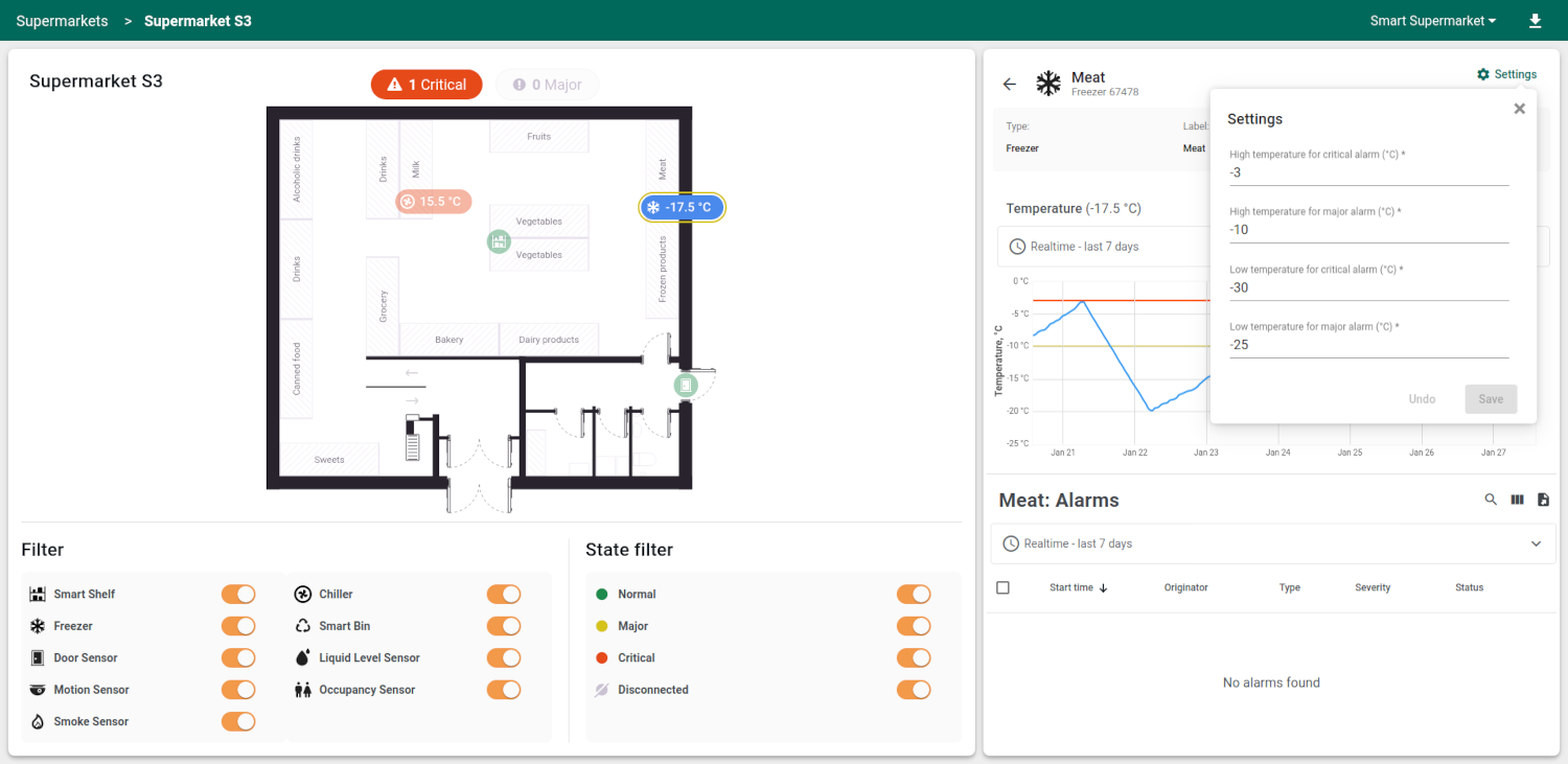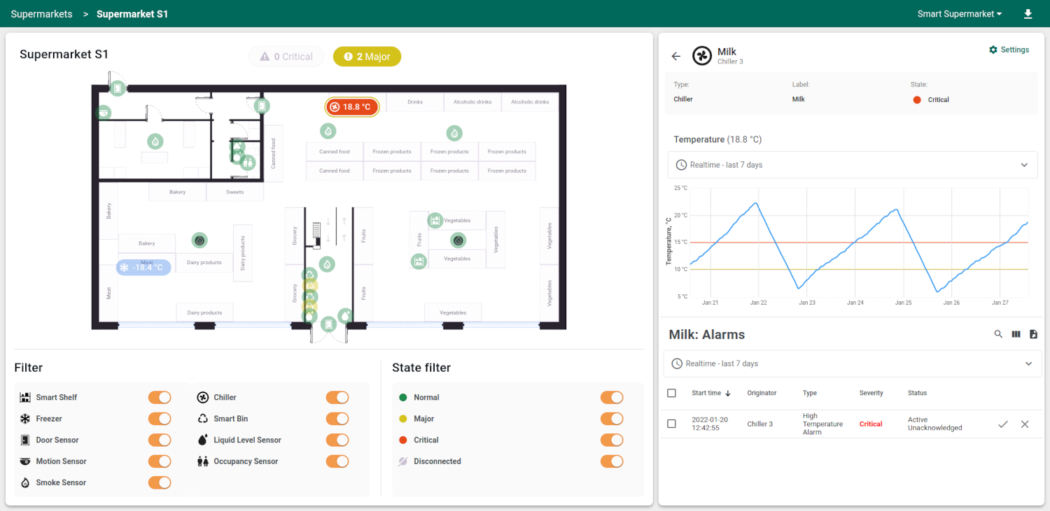 - Floor plan状态包含带超市平面图的室内地图与设备标记。除地图外,该状态还包含两个过滤器:按设备类型与设备状态。过滤设置保存在用户级别。