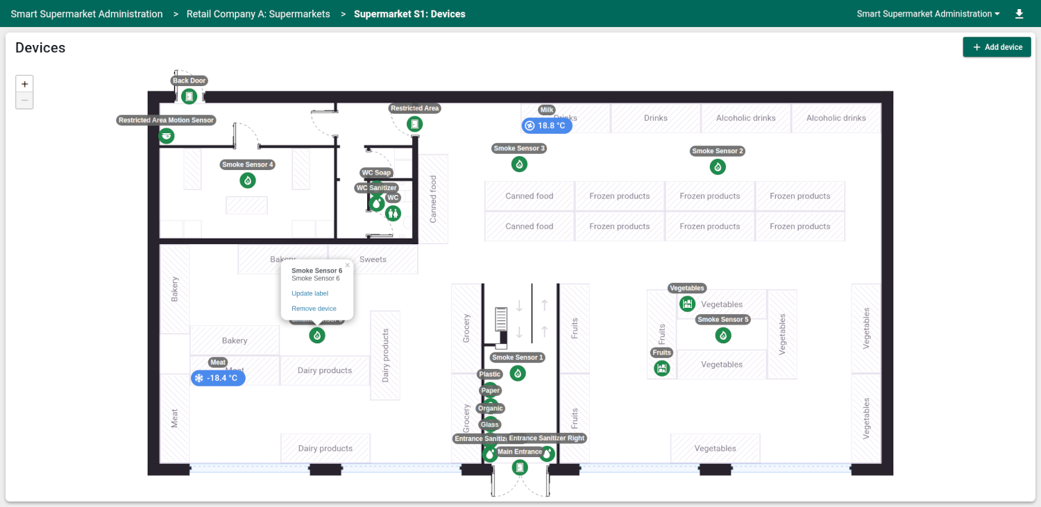 - Supermarket devices状态显示带超市平面图与设备标记的室内地图。您可拖放设备标记以定义设备在超市中的精确位置。