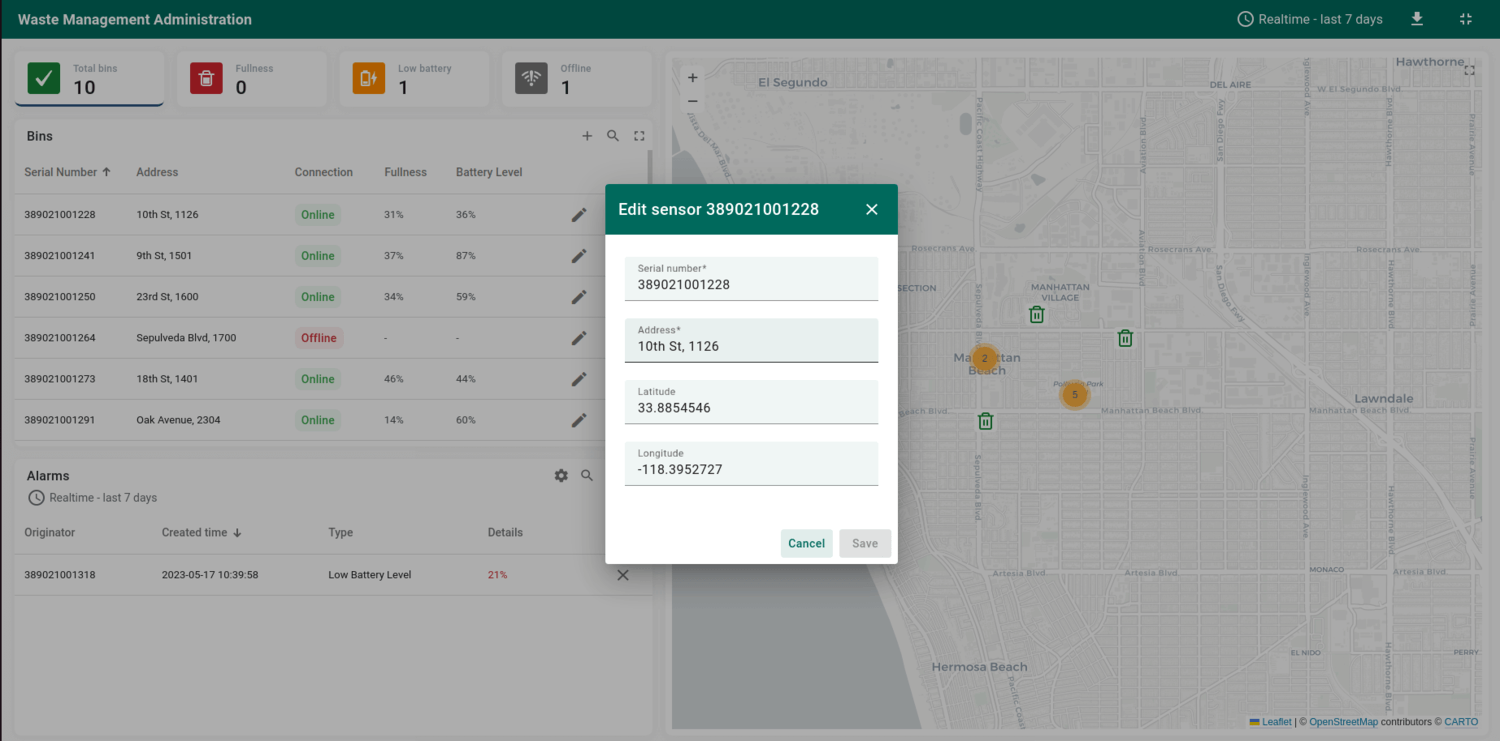 - 查看并编辑特定垃圾箱的基本信息与传感器位置;
