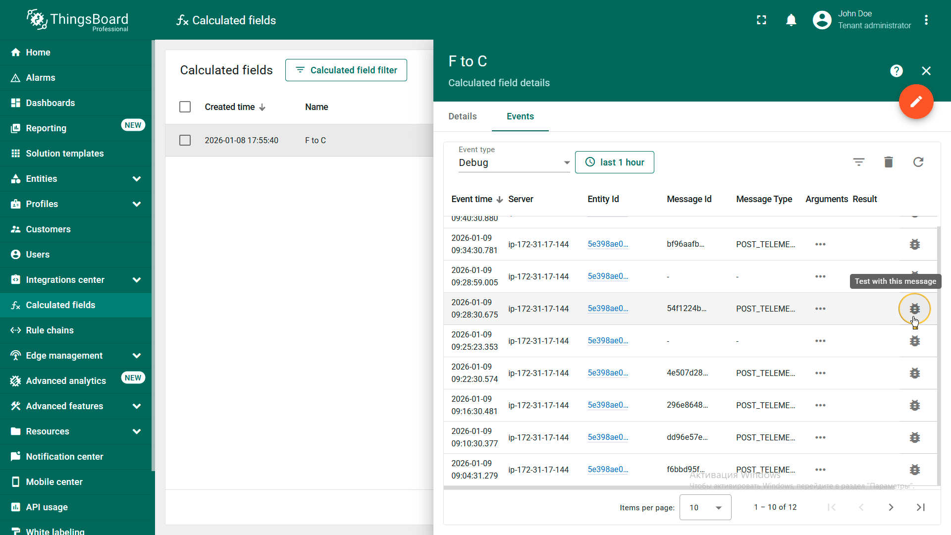 每个字段计算可切换至调试模式。启用后,ThingsBoard会记录每次执行的详细信息,包括触发执行的输入参数(如传入时间序列或属性更新)及计算结果或执行问题(脚本错误、缺失参数、无效值等)。