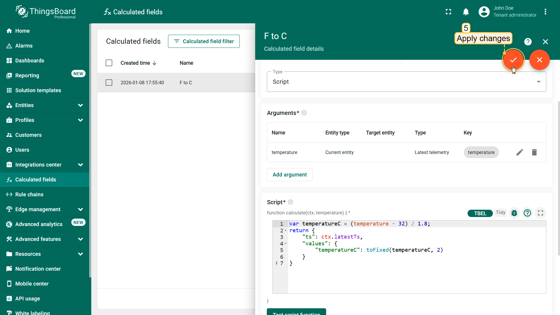 针对基于脚本的字段计算(如脚本、传播(计算结果模式)),ThingsBoard提供测试脚本函数(TBEL)模式,可在应用变更前使用真实输入数据验证执行。