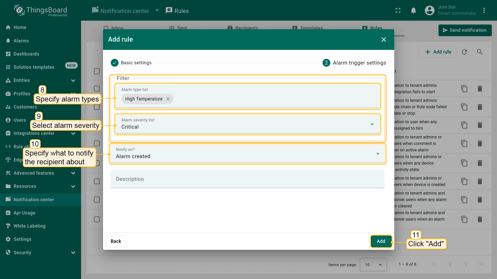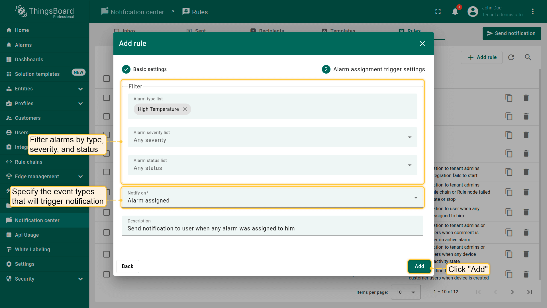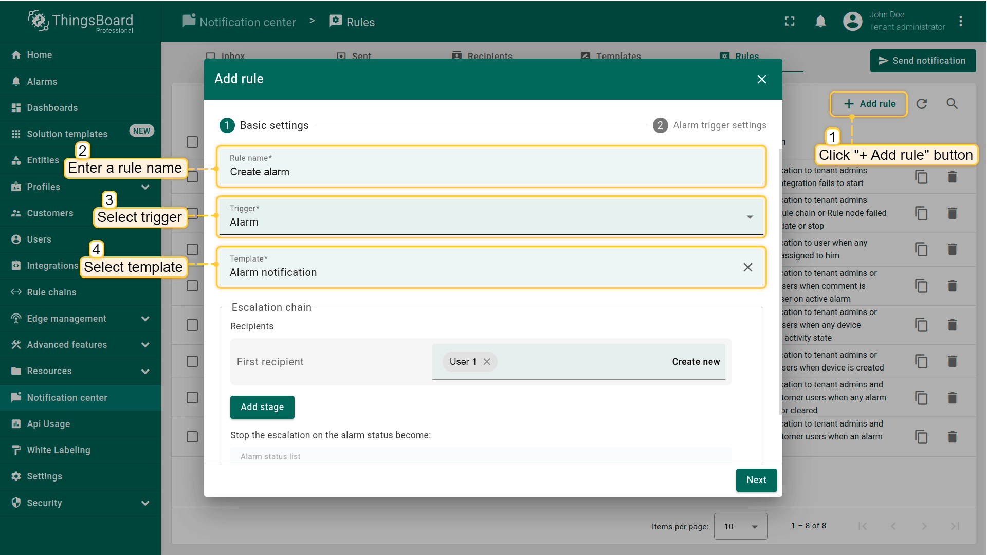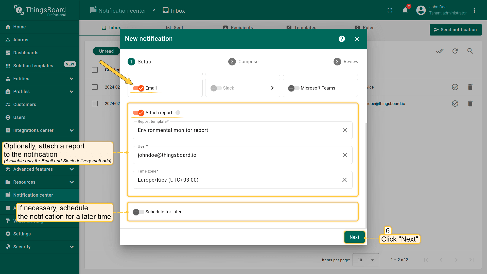 - Web。在ThingsBoard Web界面内直接接收通知,适合常驻登录的用户。