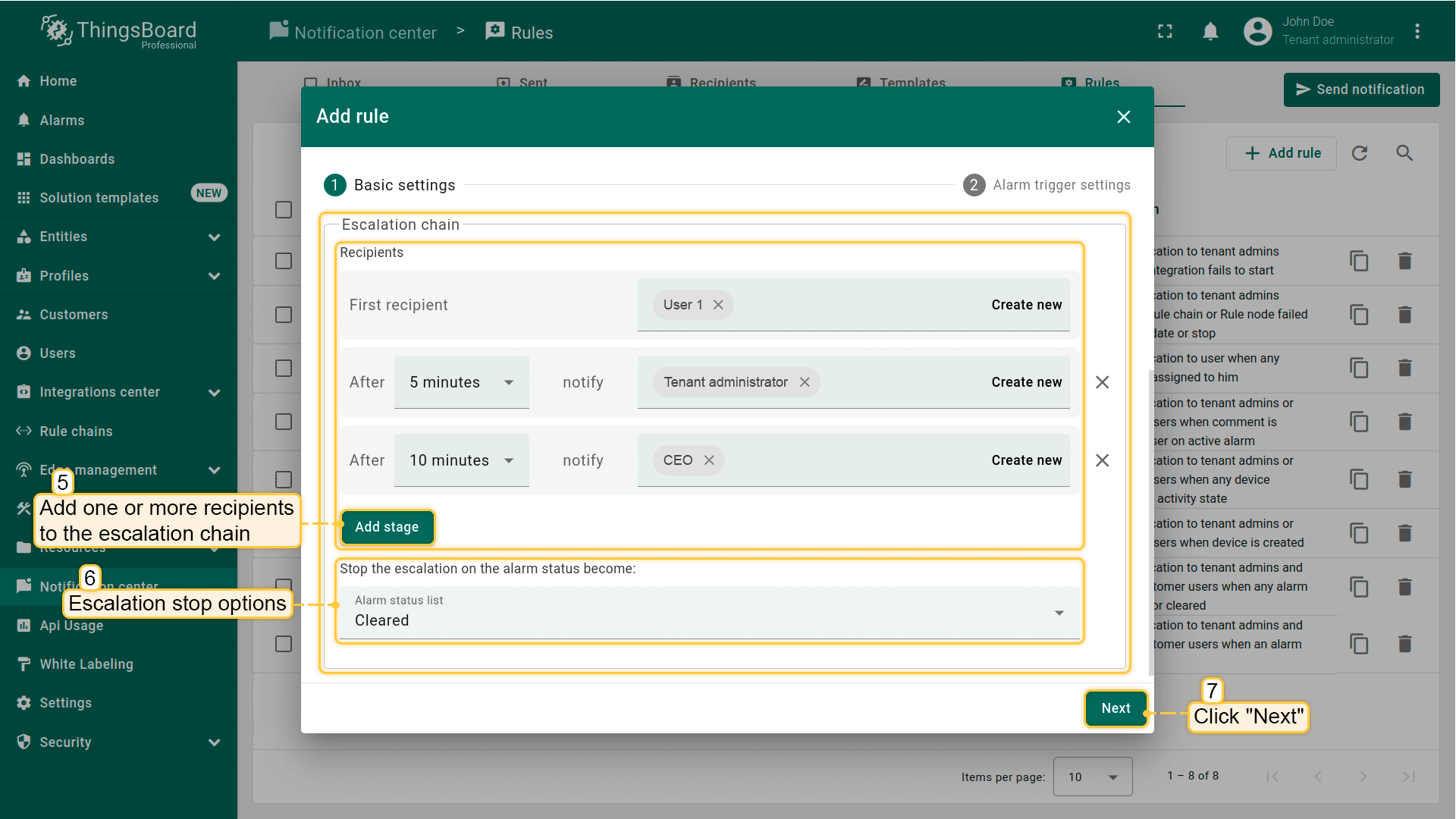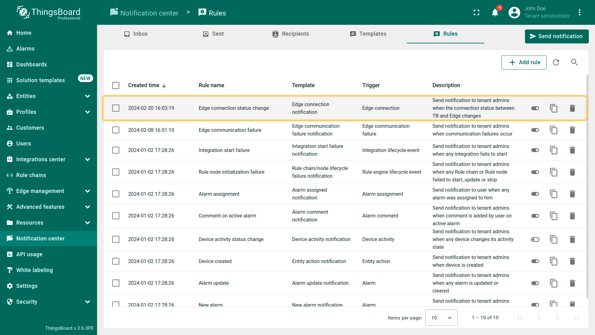 使用\u201c边缘连接\u201d规则,当TB和边缘之间的连接状态改变时,系统会向租户管理员发送通知。