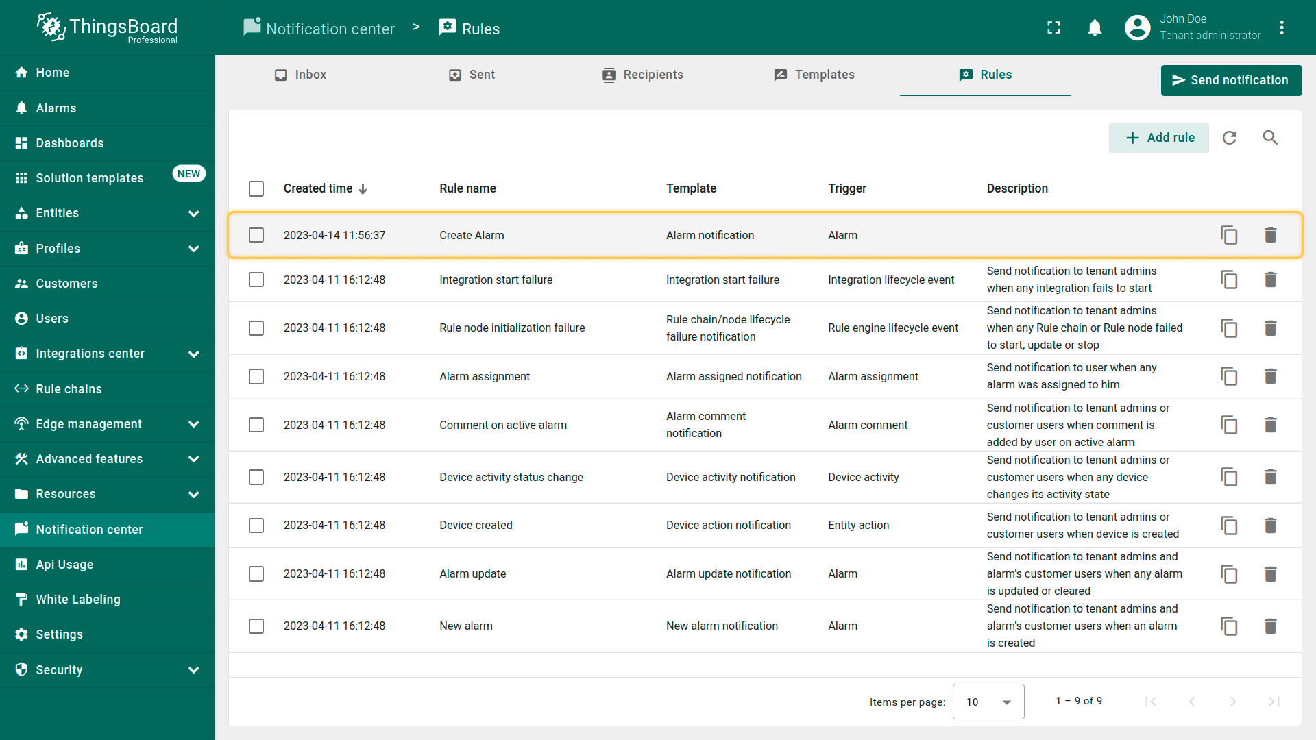 默认规则\u201c设备已创建\u201d将在创建设备时通知租户管理员。