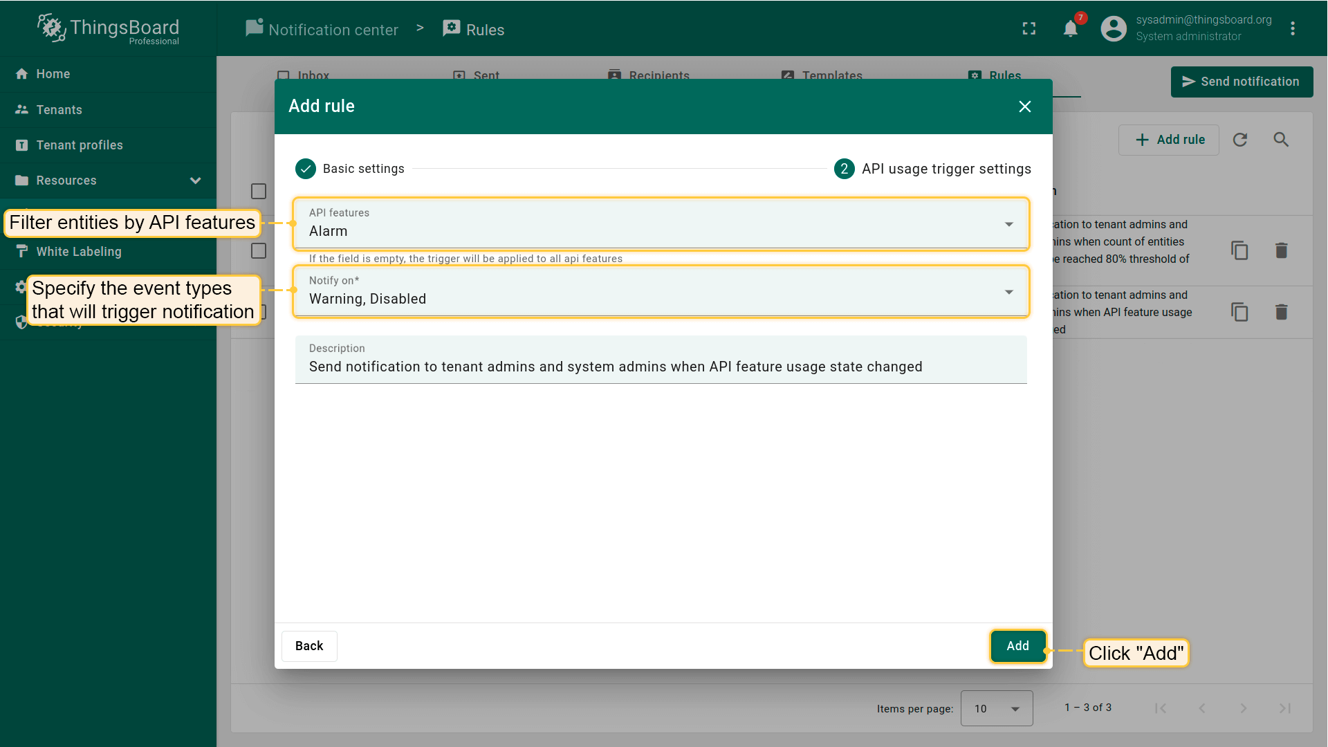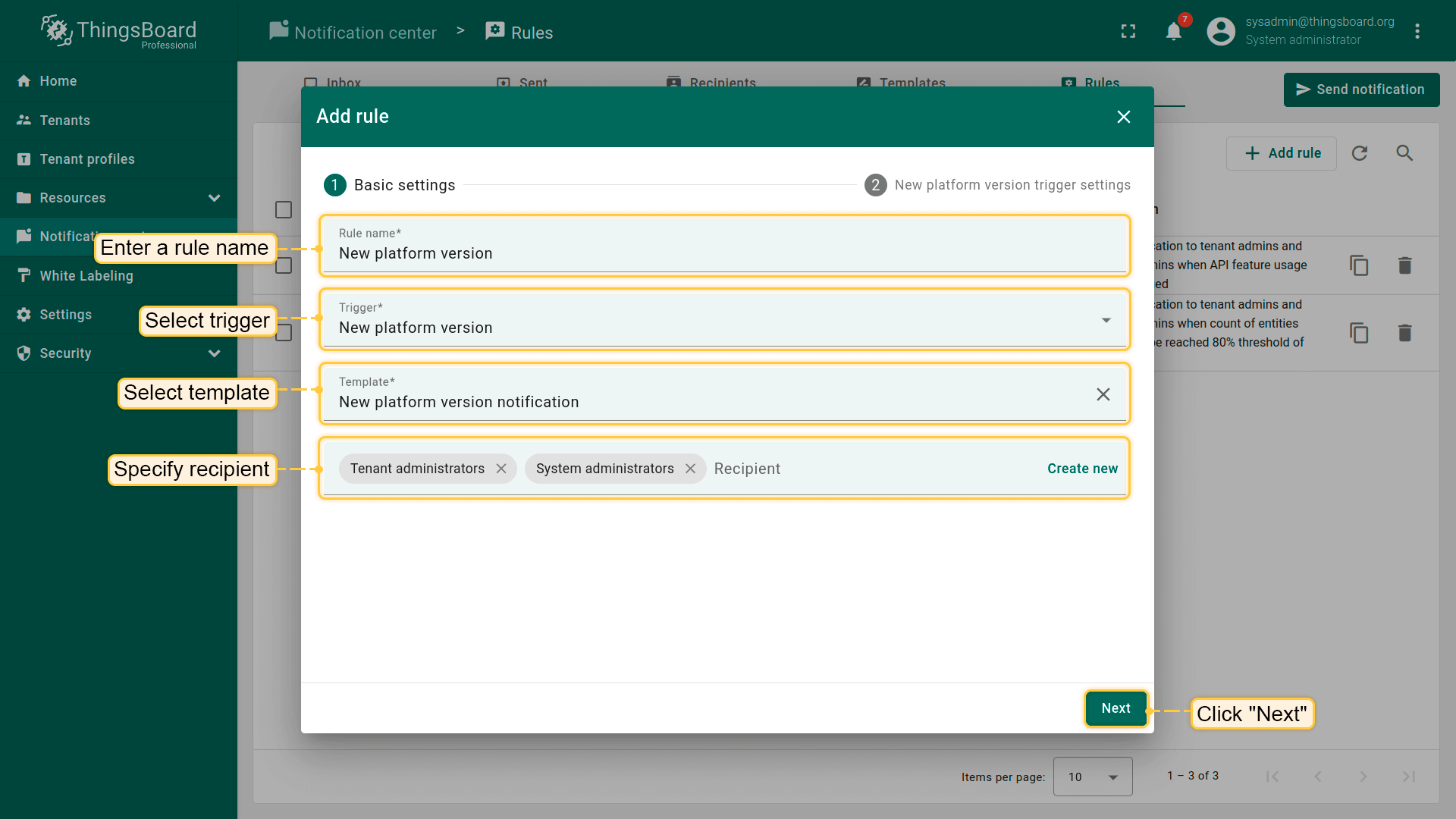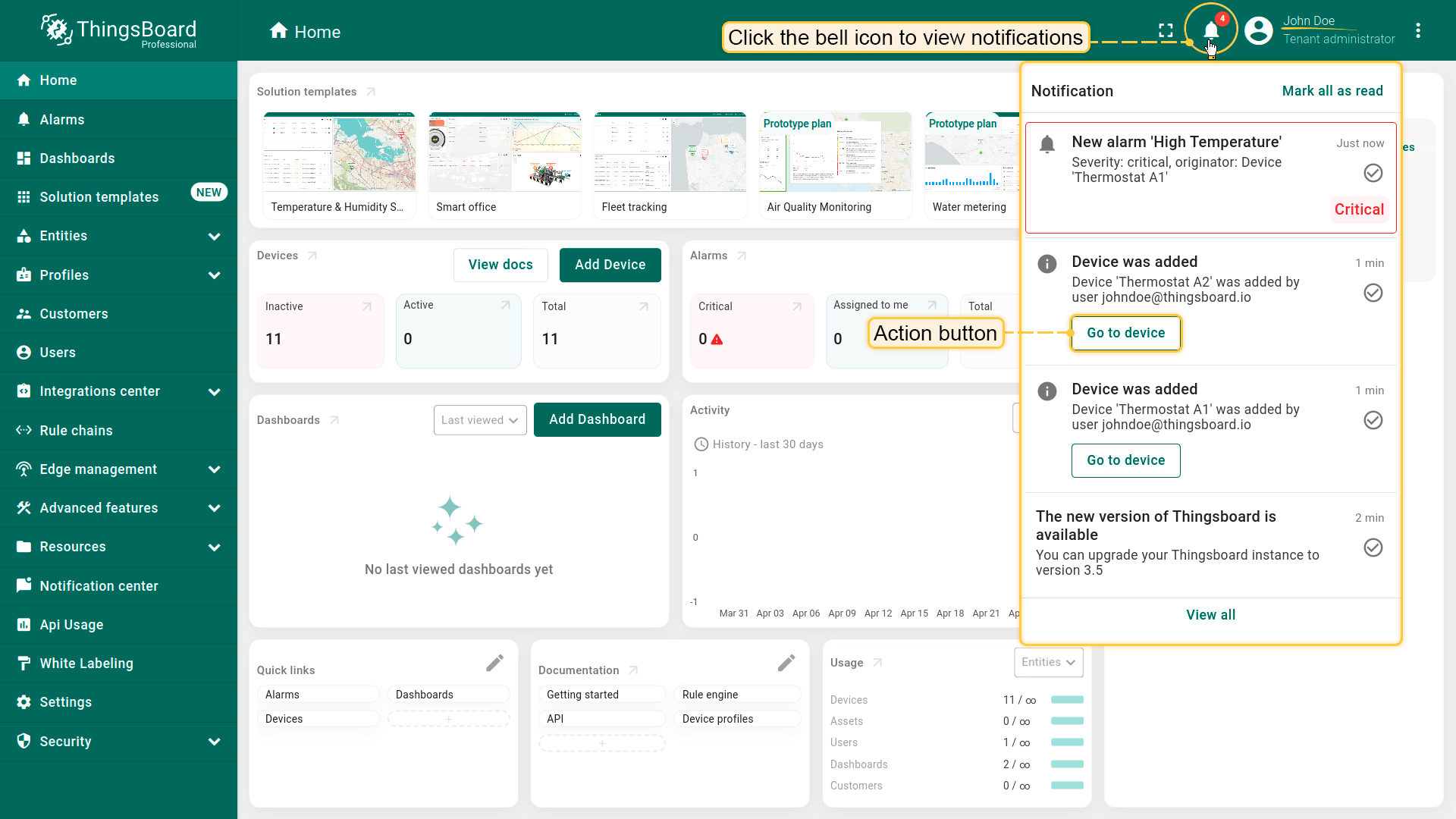 系统管理员可以使用\u201c新平台版本\u201d规则来通知租户和系统管理员ThingsBoard平台新版本的发布。