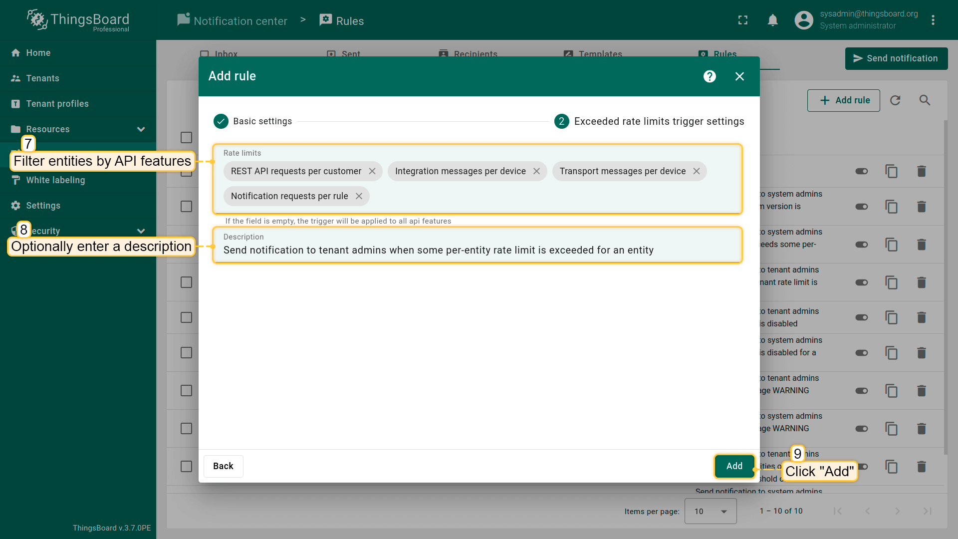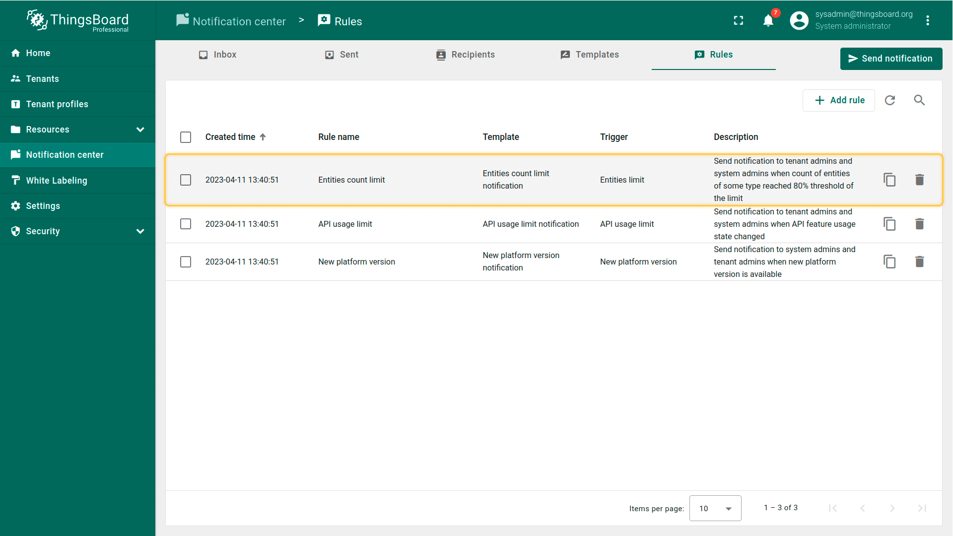 默认规则\u201c实体限制\u201d将在设备数量超过允许的80%时通知受影响的租户管理员和系统管理员。