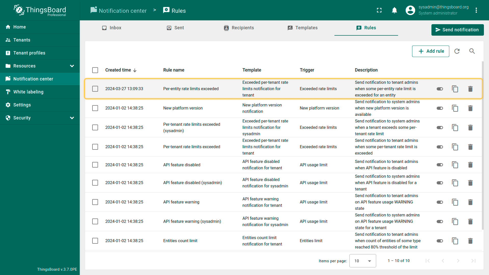 默认规则\u201c超出速率限制\u201d将在超出速率限制时通知受影响的租户管理员和系统管理员。