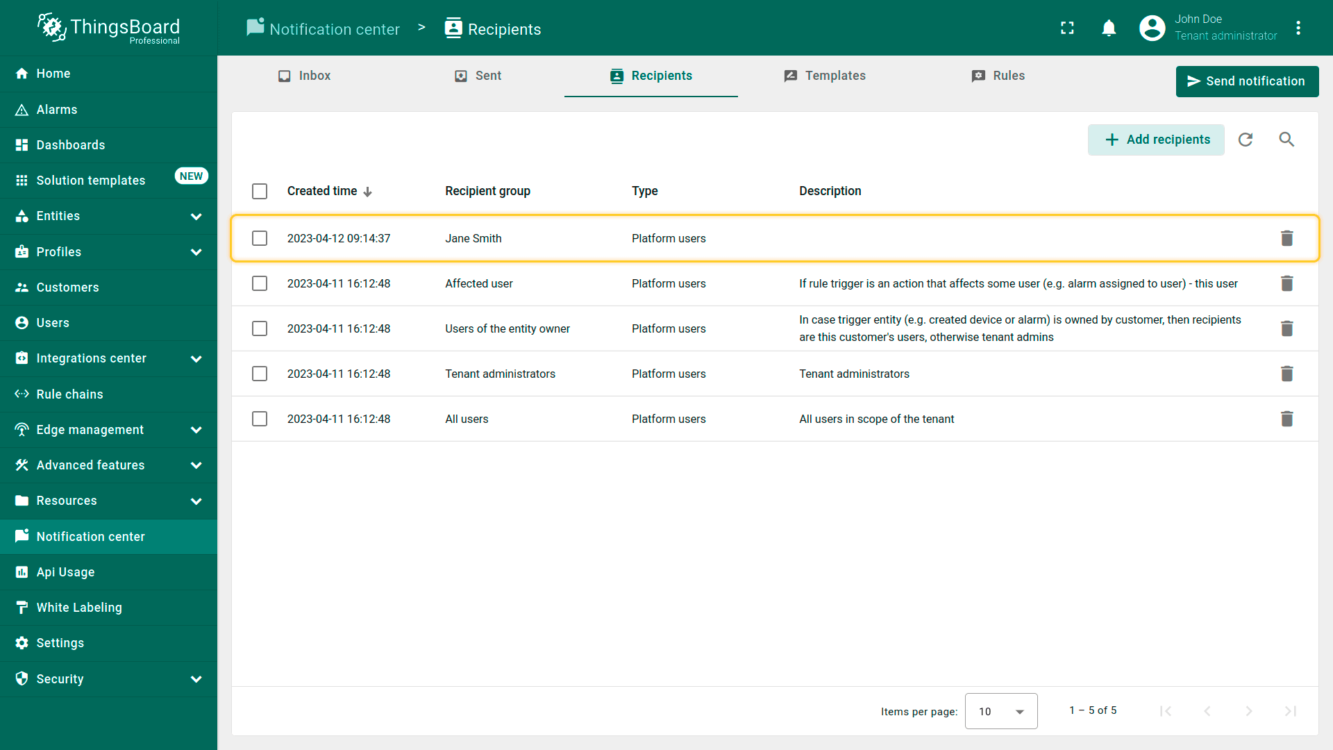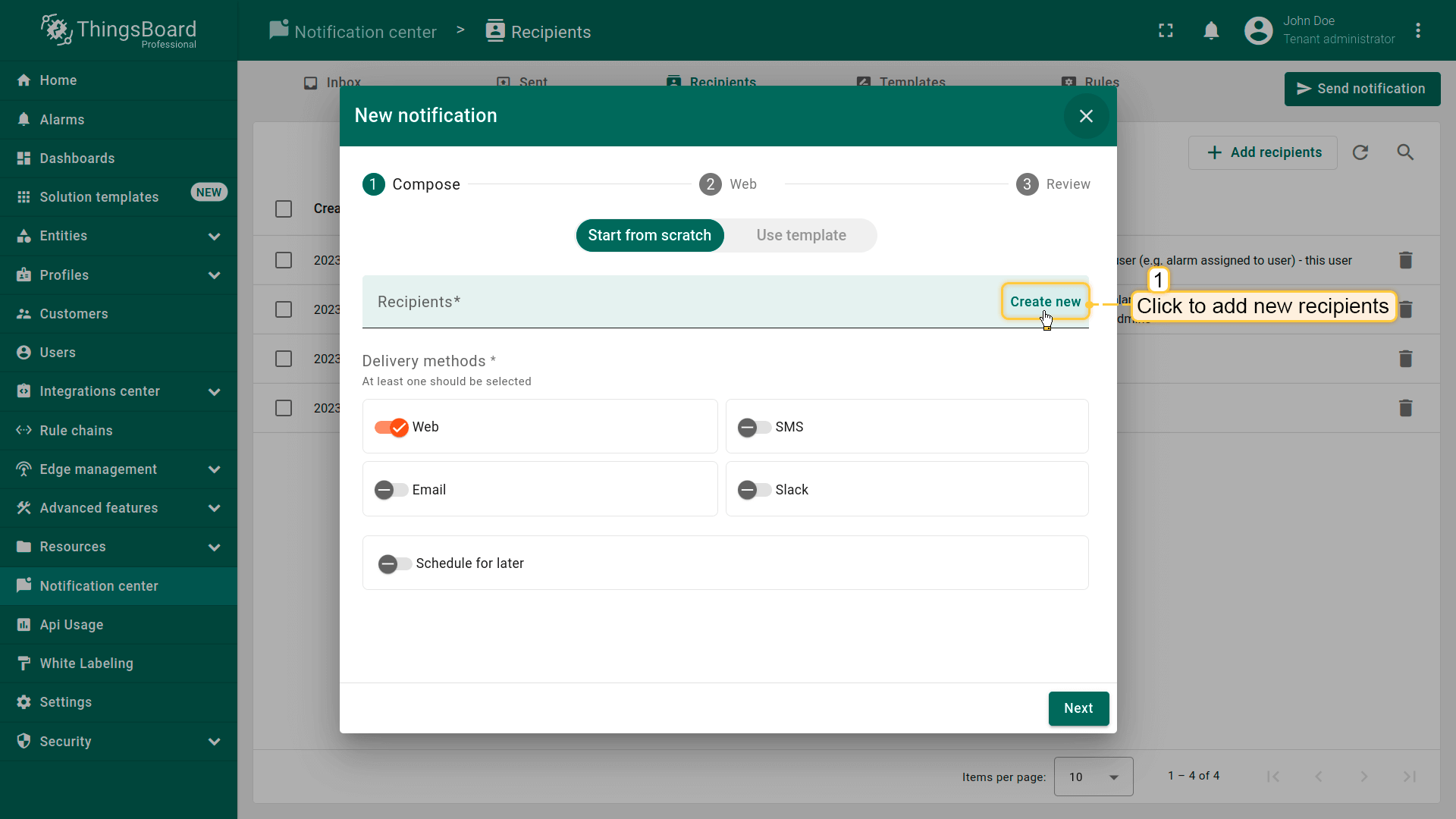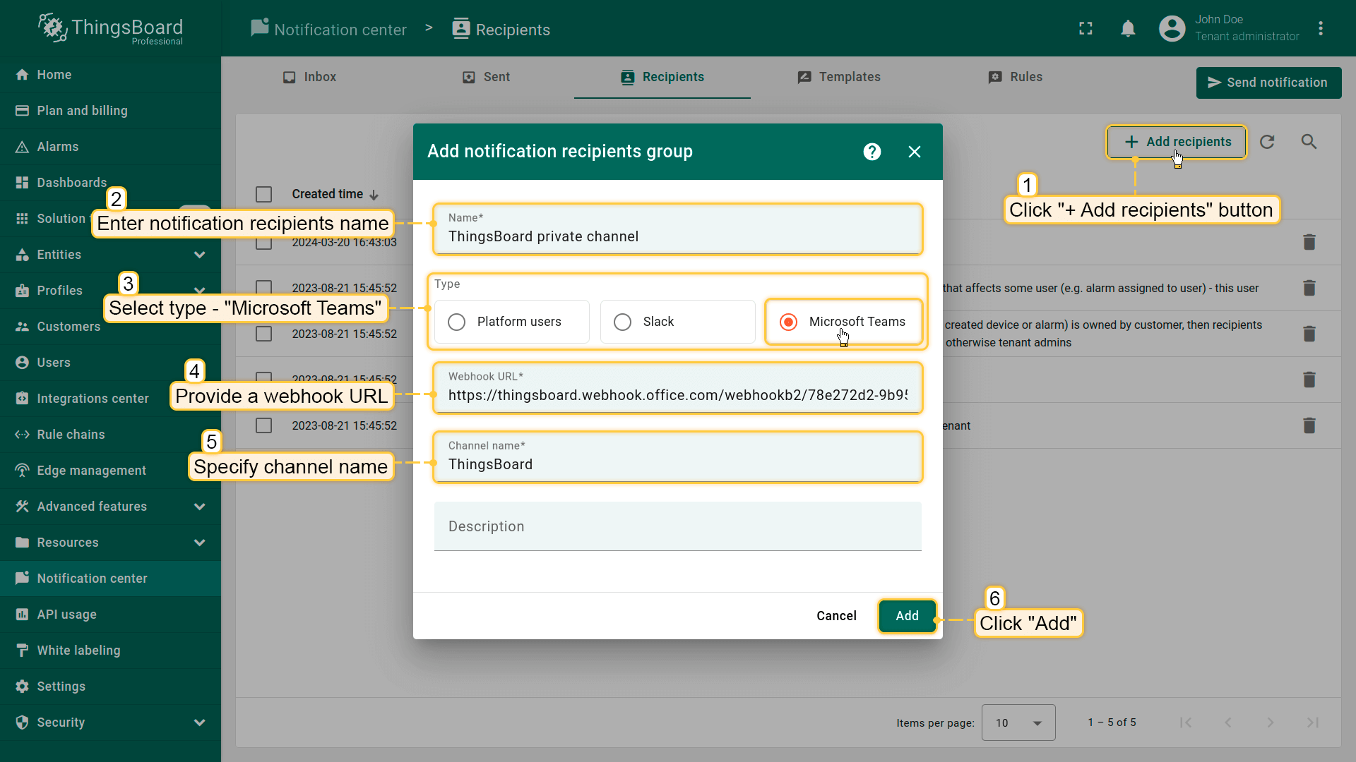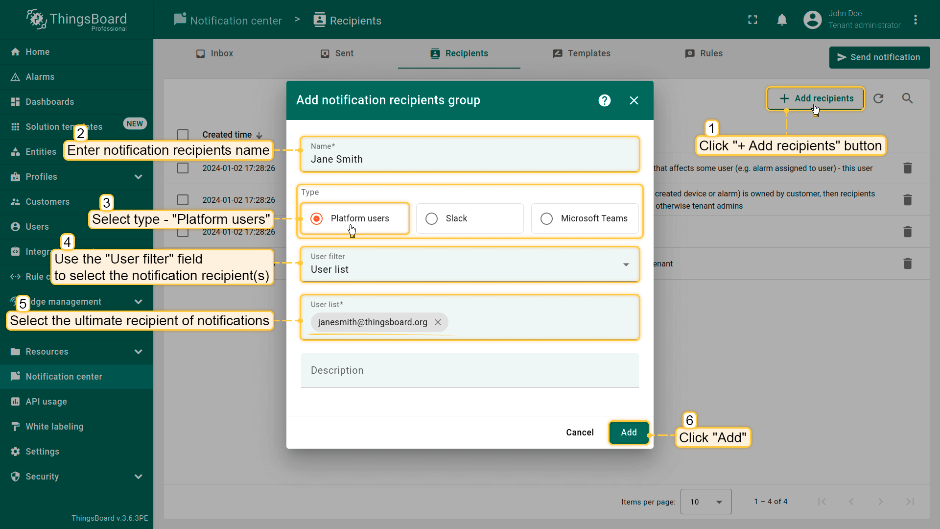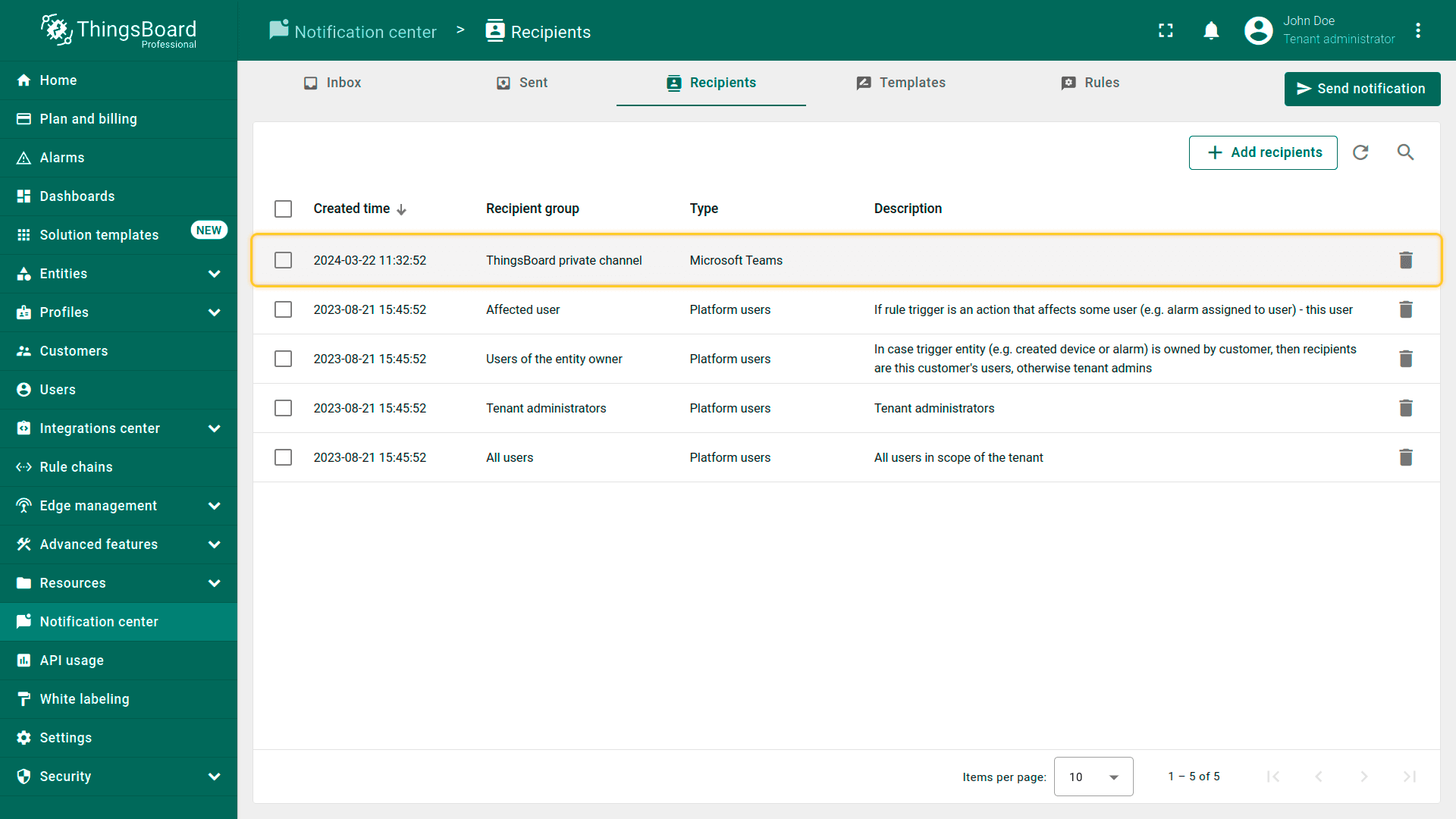 对于通过移动应用、SMS和邮件投递通知,适用我们之前在通知投递方式部分介绍的基本配置要求。对于通过ThingsBoard平台、Microsoft Teams和Slack投递通知,你需要在添加收件人阶段指定通知的确切目标。
