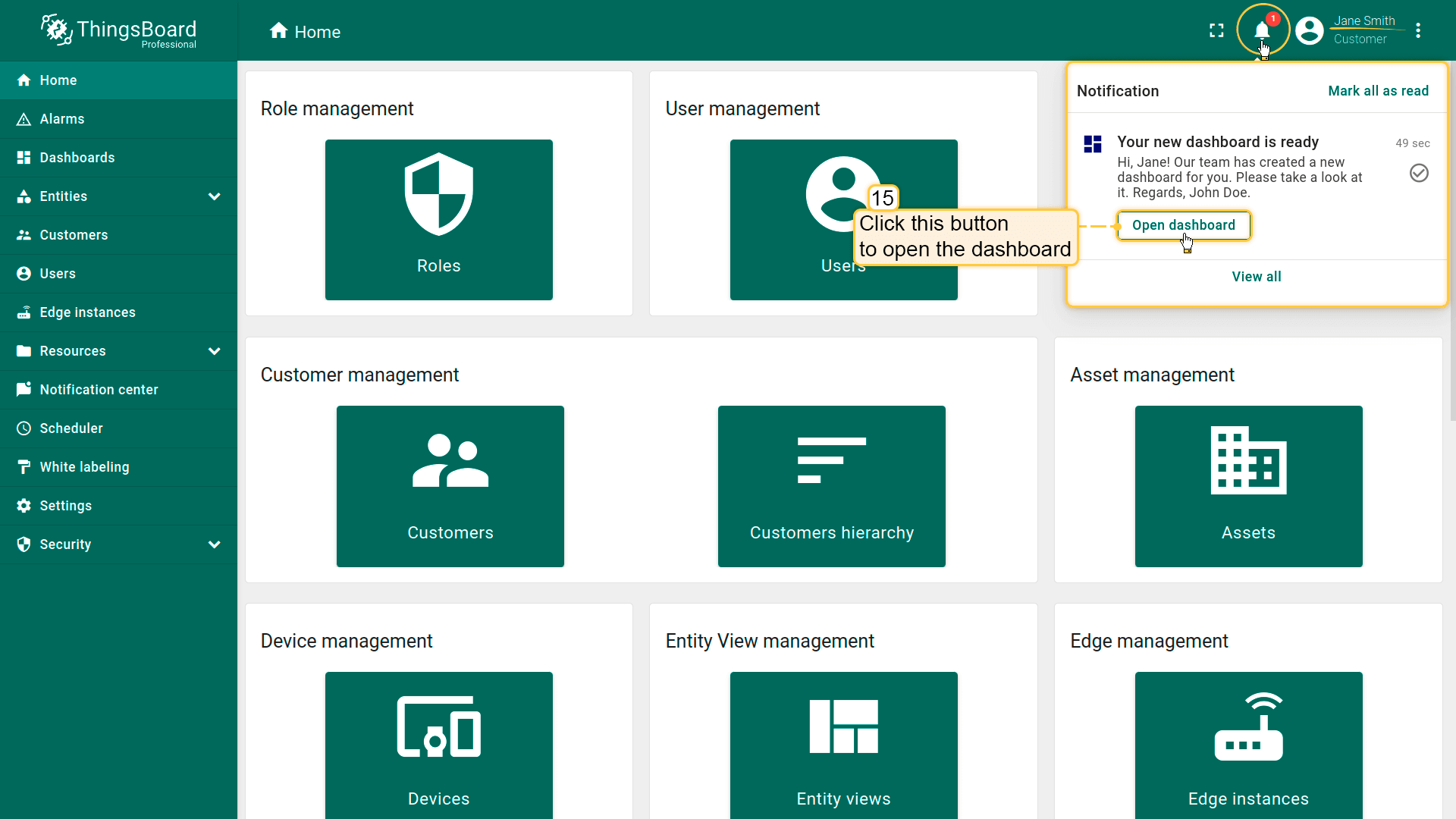 收件人会在ThingsBoard界面收到通知,可在通知中心页面或通过右上角铃铛图标查看。点击通知中的\u201c打开此仪表盘\u201d按钮会打开对应仪表盘。