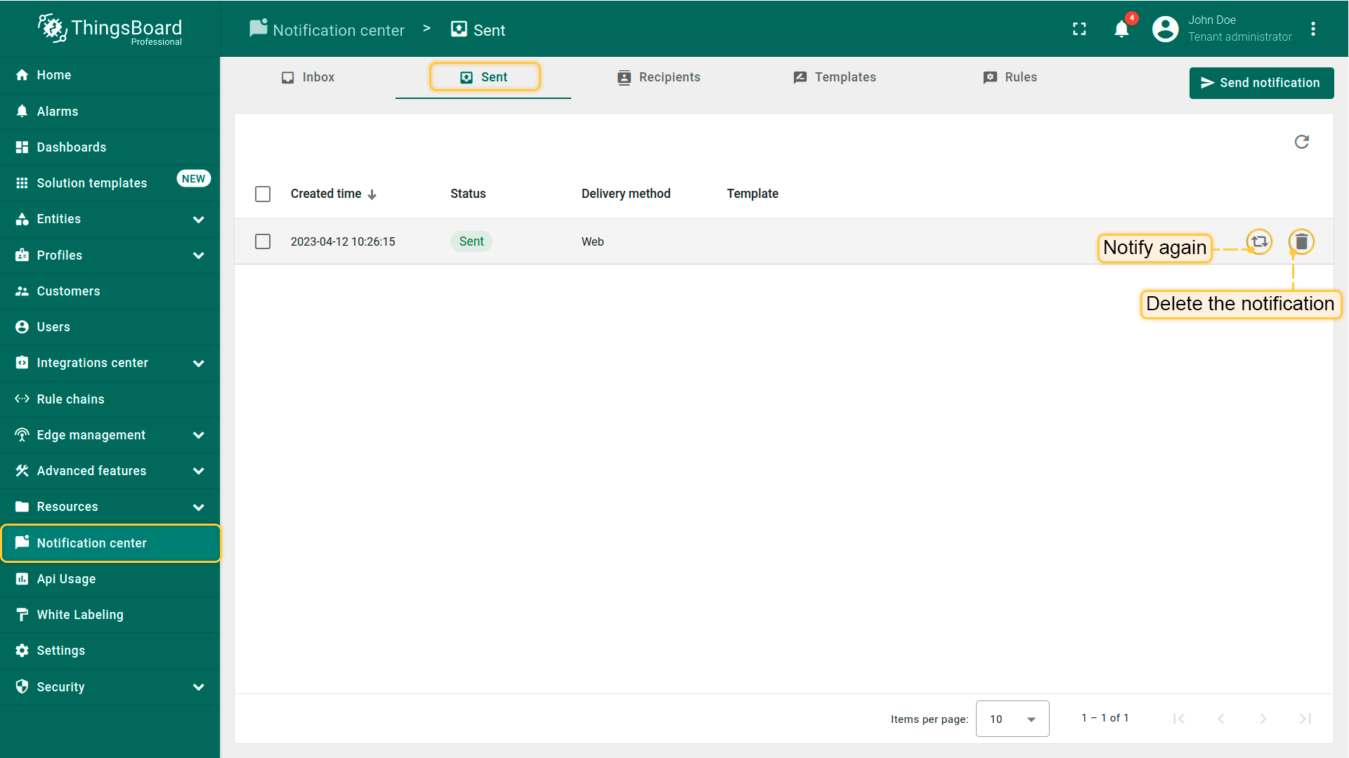 通知中心可通过侧边栏菜单访问,提供发送通知、查看收件箱和已发送、管理收件人、创建模板以及为自动通知设置规则等功能。