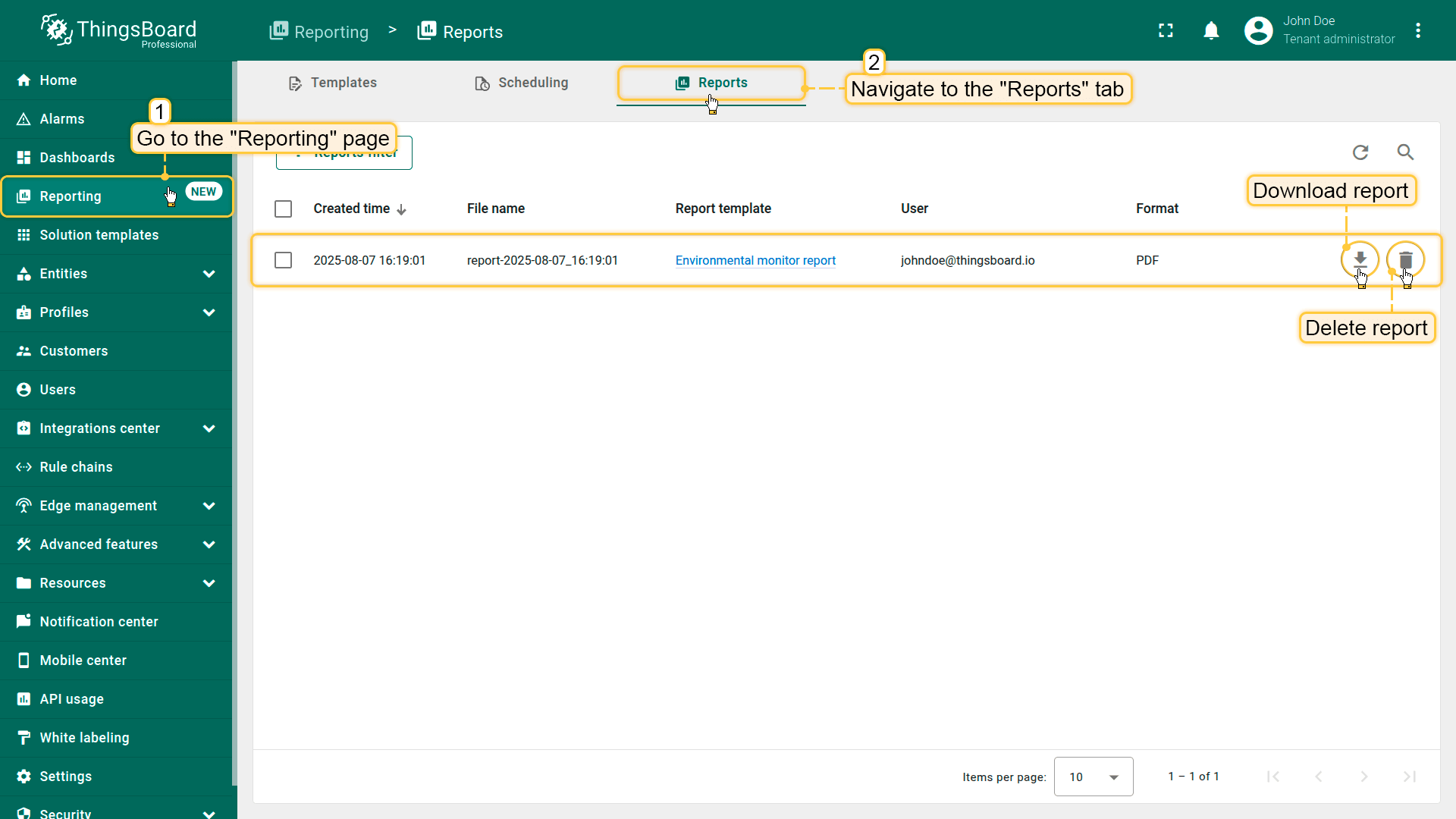 报表“标签页存储所有生成的报表。在此您可以: