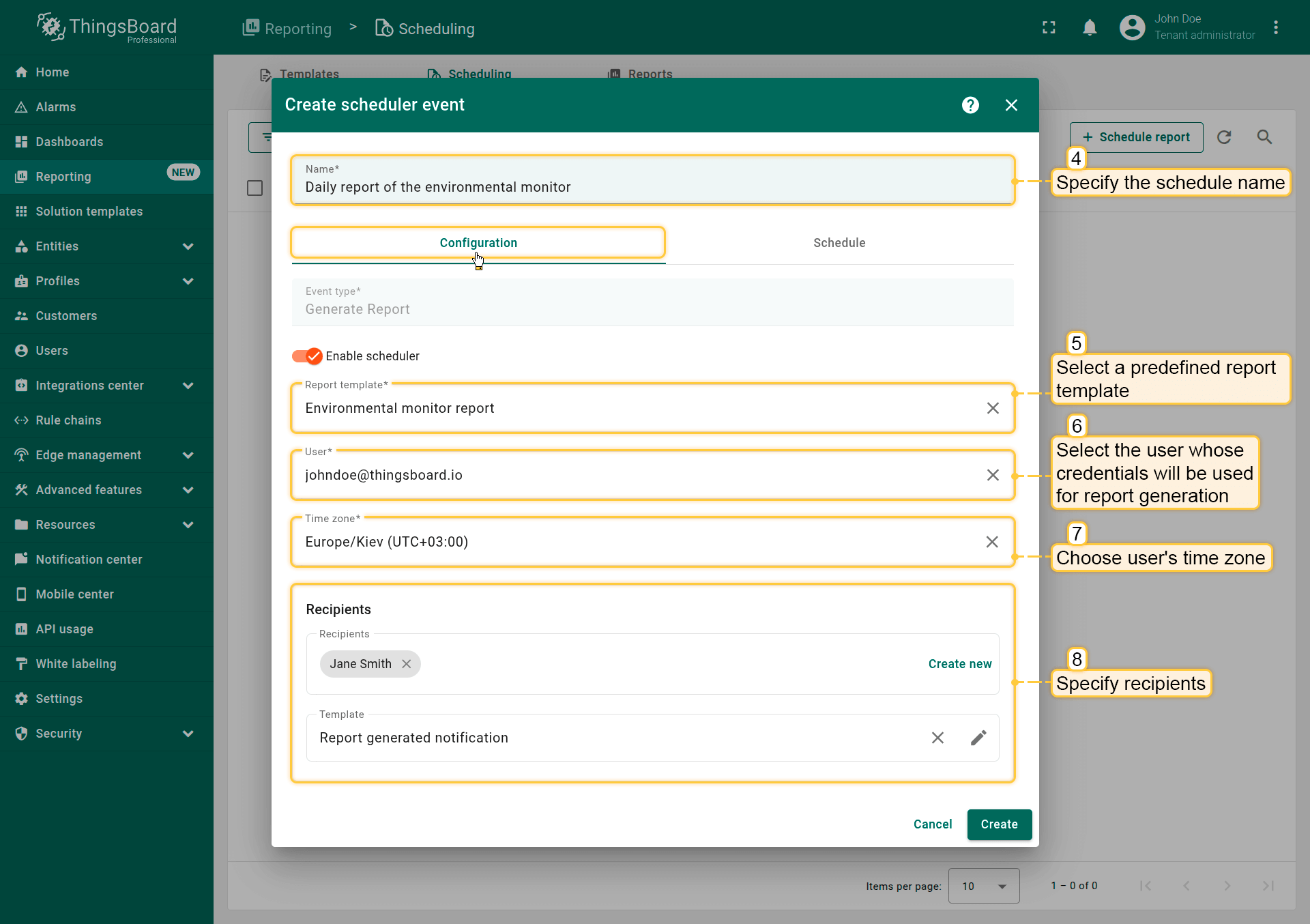• 定义收件人和格式 — 选择谁收到报表以及以什么格式(PDF、CSV)。