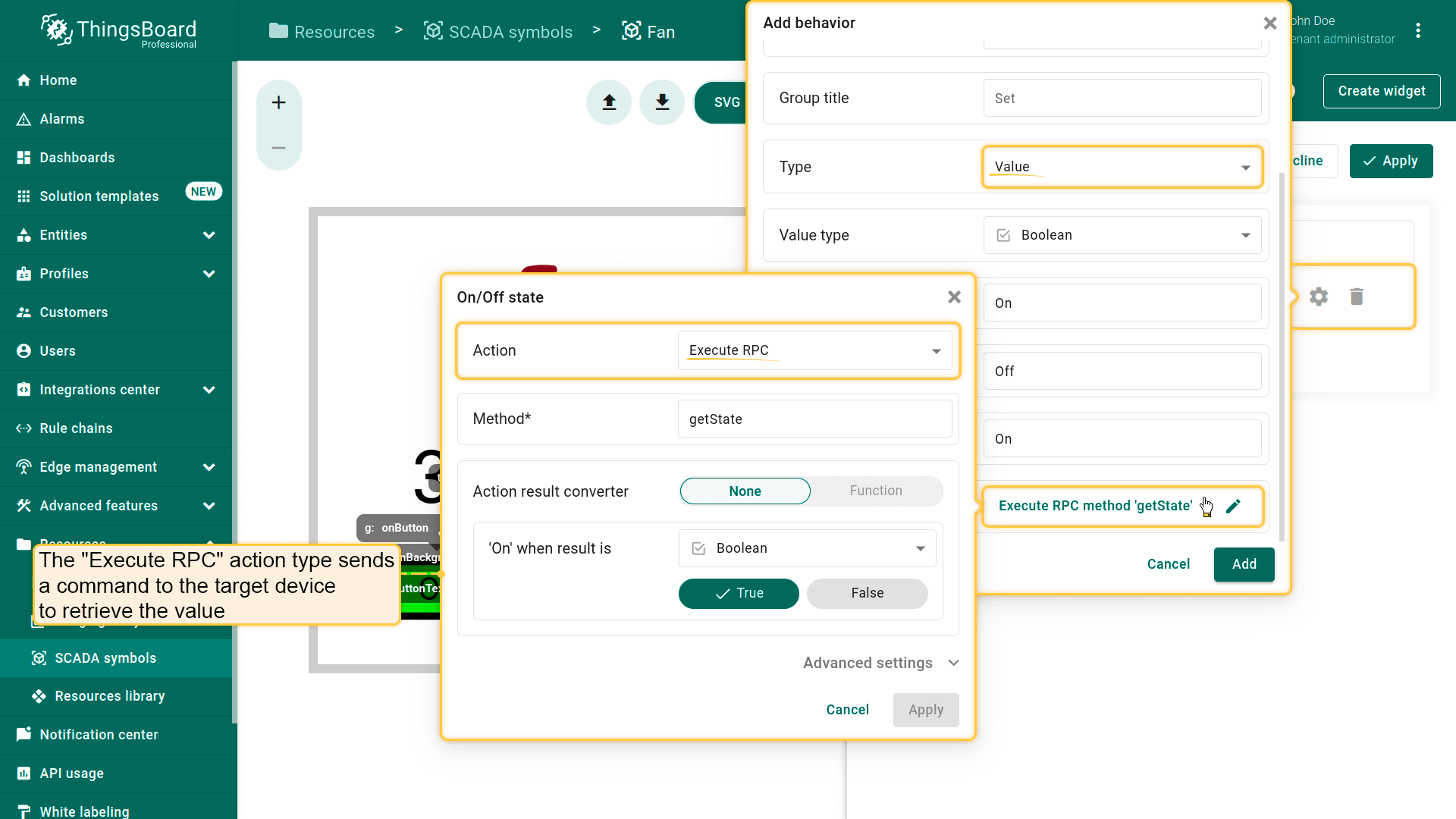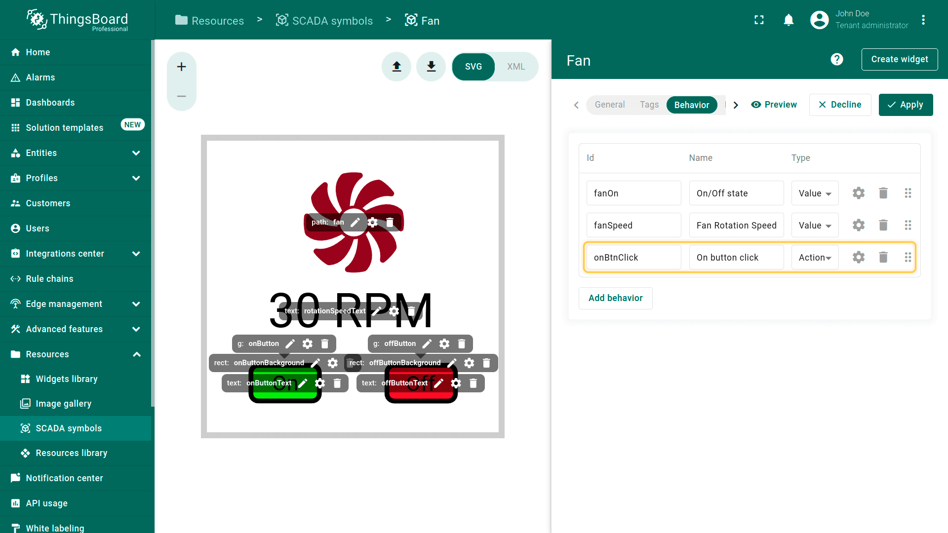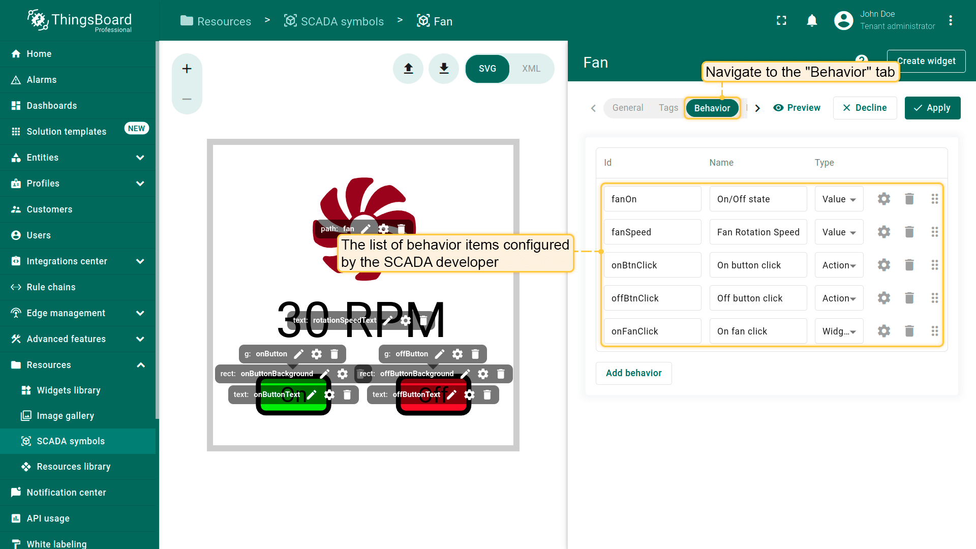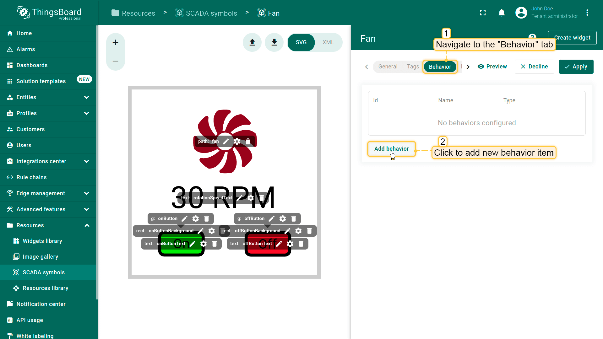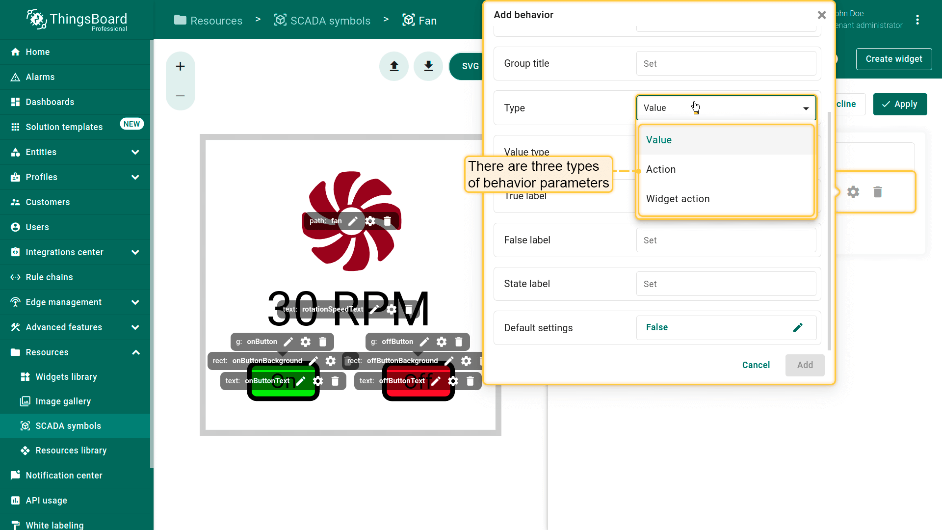 Behavior:描述SCADA symbol如何从平台接收数据,以及其在device或dashboard上触发的操作;