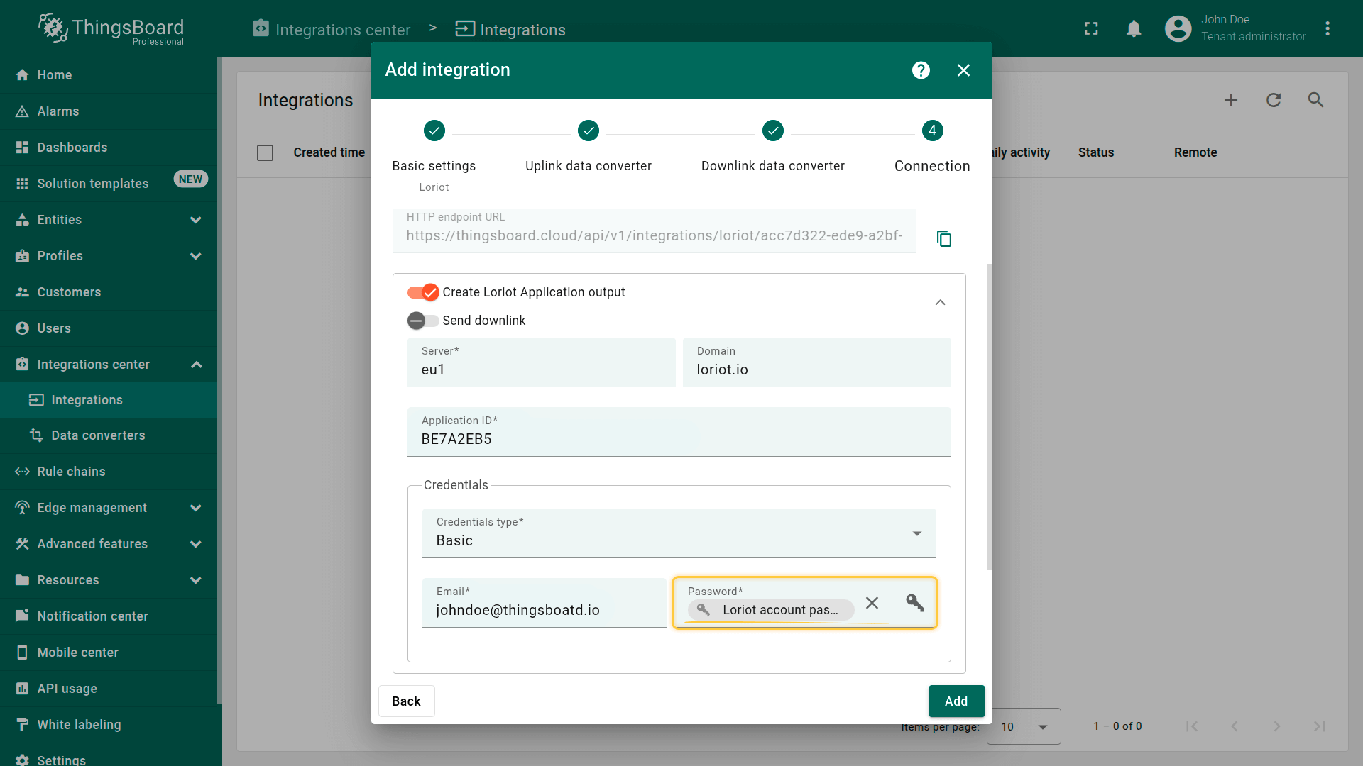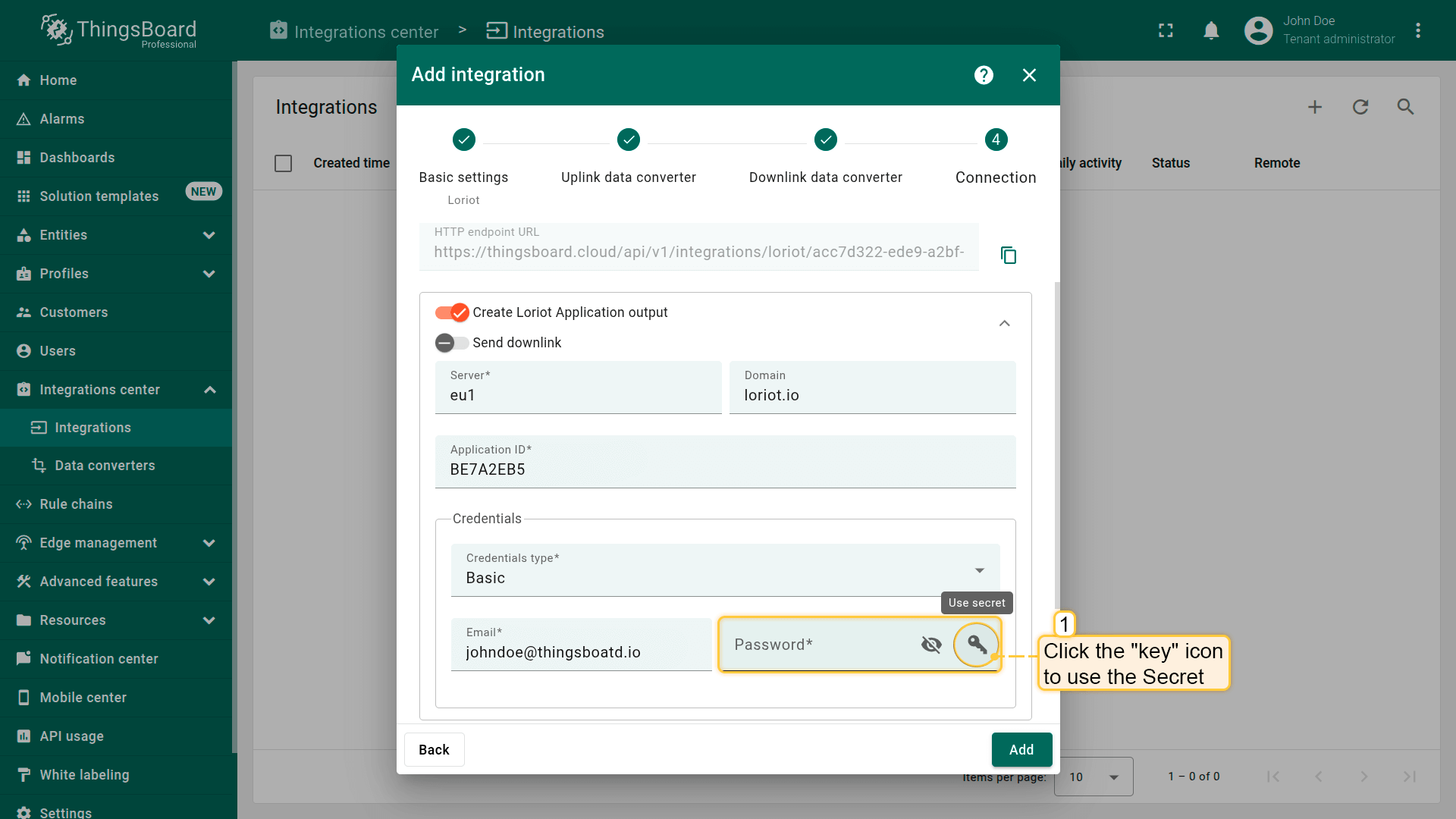 以 Loriot集成为例:无需手动输入Loriot账户密码,可使用已创建的Secret进行安全访问。