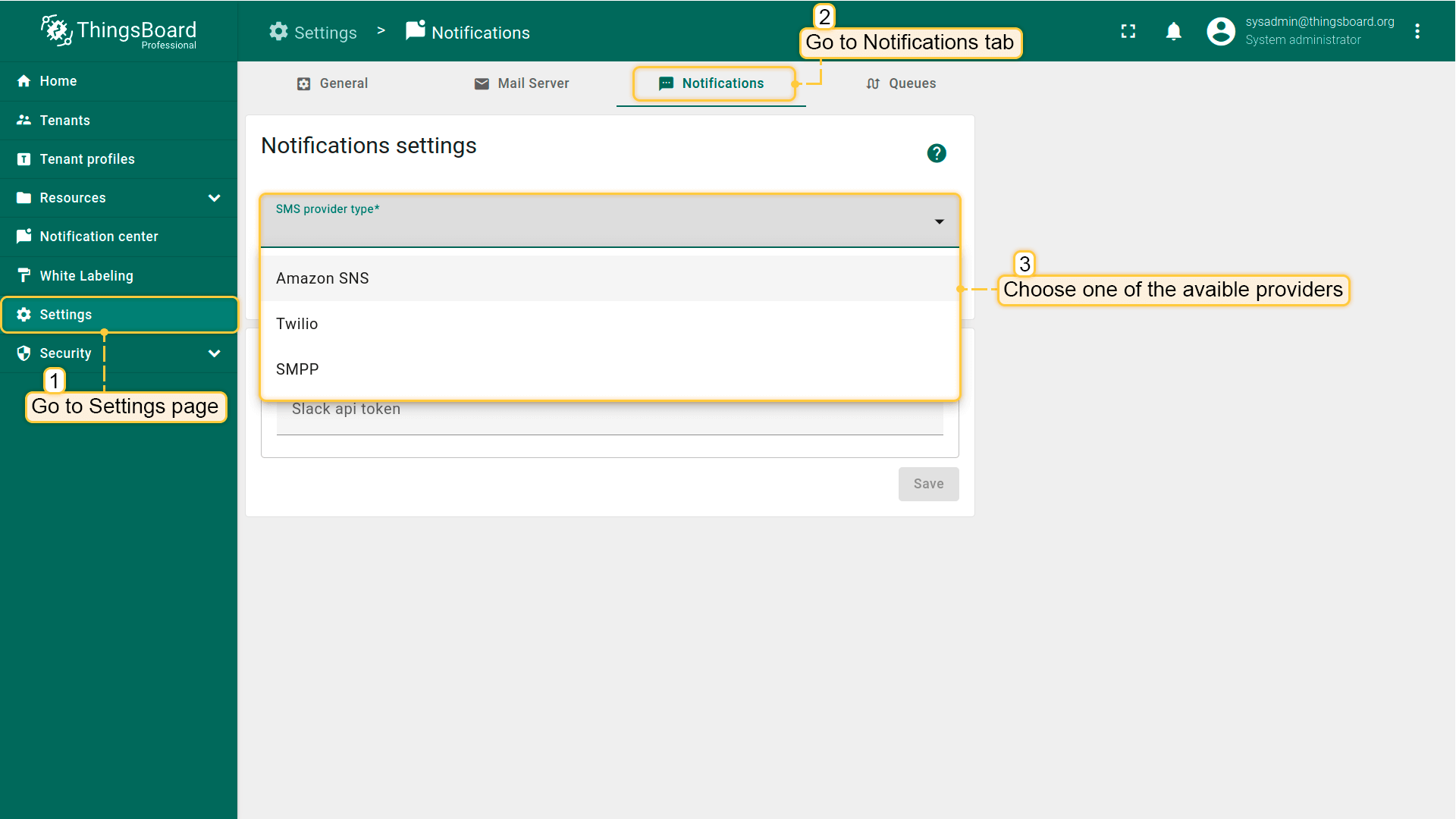 - 登录ThingsBoard UI。导航至"Settings"页面。然后进入"Notificatons"选项卡。在此窗口中选择可用提供商之一:AWS SNS、Twilio或SMPP;