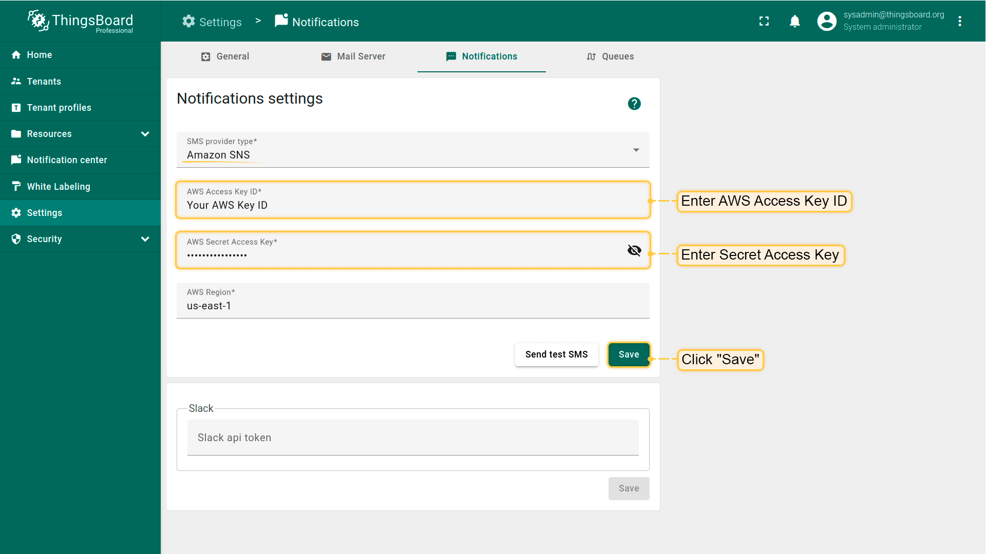 - 若选择AWS SNS,请填写AWS Access Key ID和Secret access key。点击"Save"按钮;