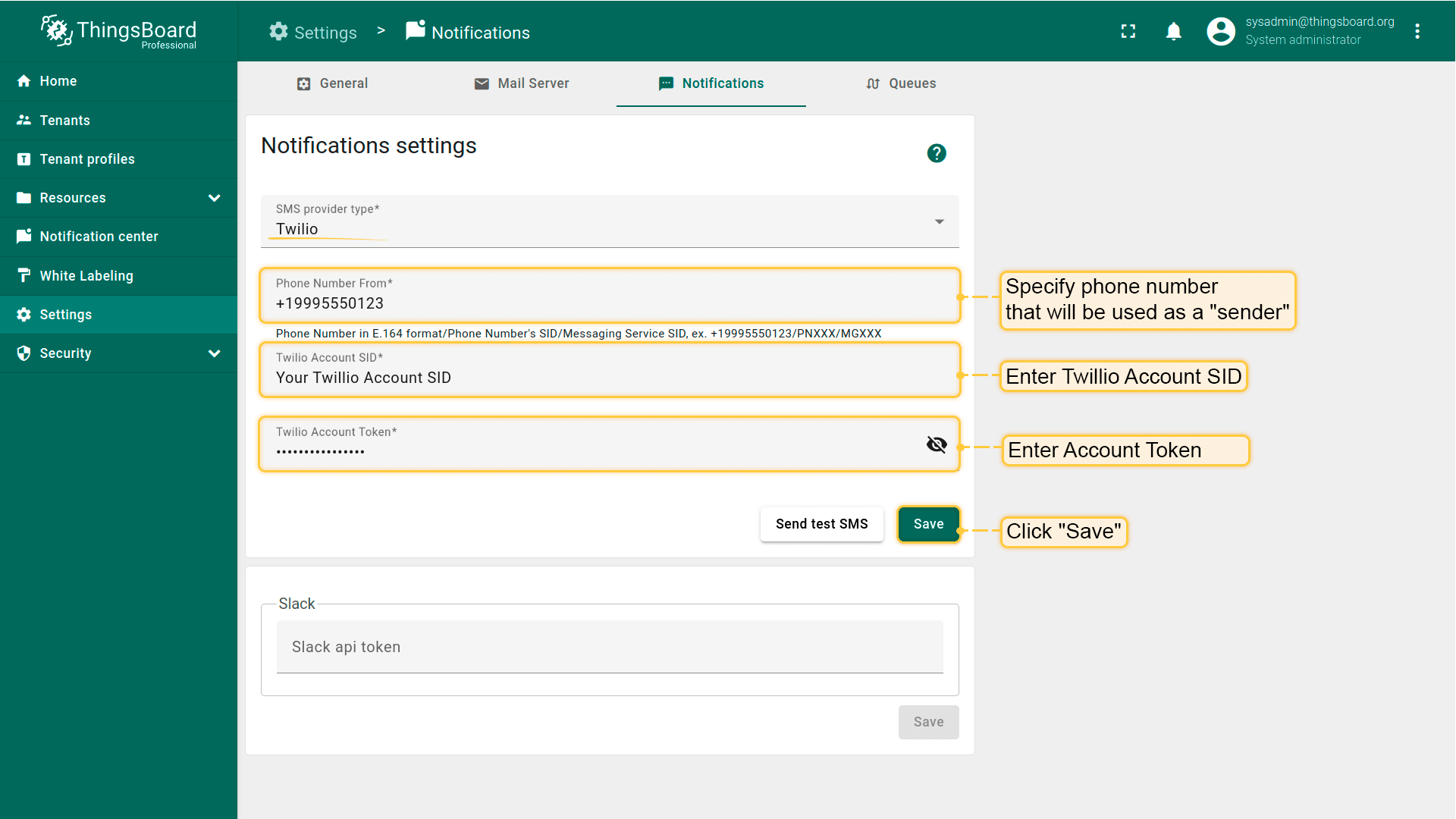 - 若选择Twilio,请填写Twilio account SID和Token。指定将用作"sender"的电话号码。点击"Save"按钮;