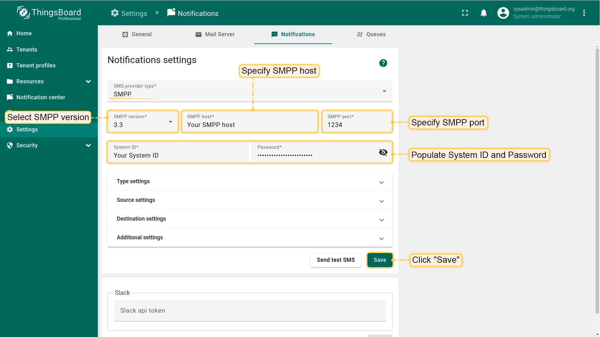 - 若选择SMPP,请填写System ID和Password。指定SMPP版本、SMPP主机和端口。点击"Save"按钮。
