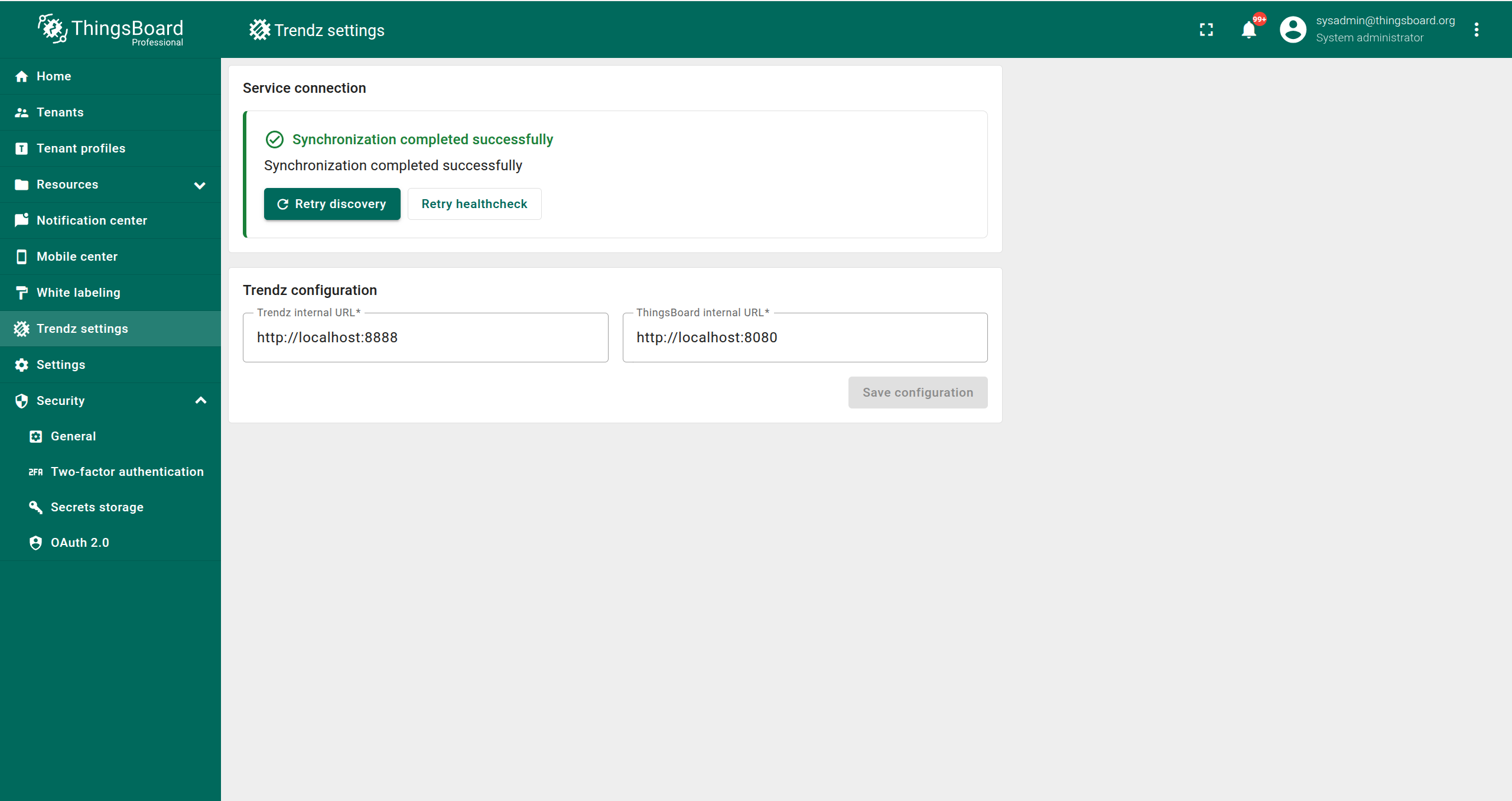- Retry Healthcheck - (仅当Trendz已与ThingsBoard同步时可见)检查Trendz同步当前是否存在错误。