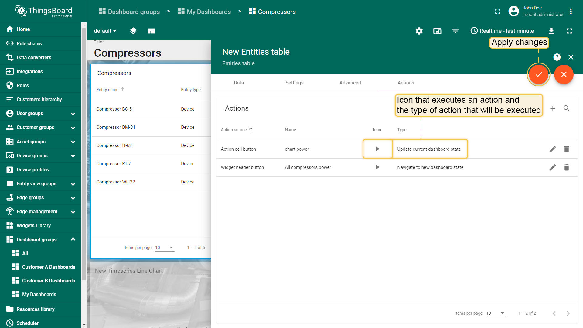 部件设置实体复选框负责将特定实体从部件添加到状态允许通过创建“来自仪表板状态的实体”或其他别名来使用目标仪表板状态中的实体。例如:表格部件中有设备列表并且希望在单击表格行时显示特定的设备详细信息。