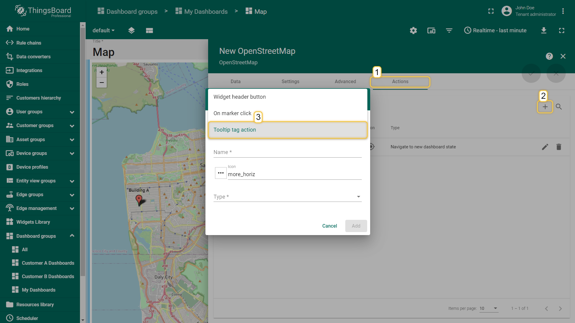 通过地图部件右上角的“铅笔”图标进入编辑模式导航到操作单元格单击“+”图标添加操作。