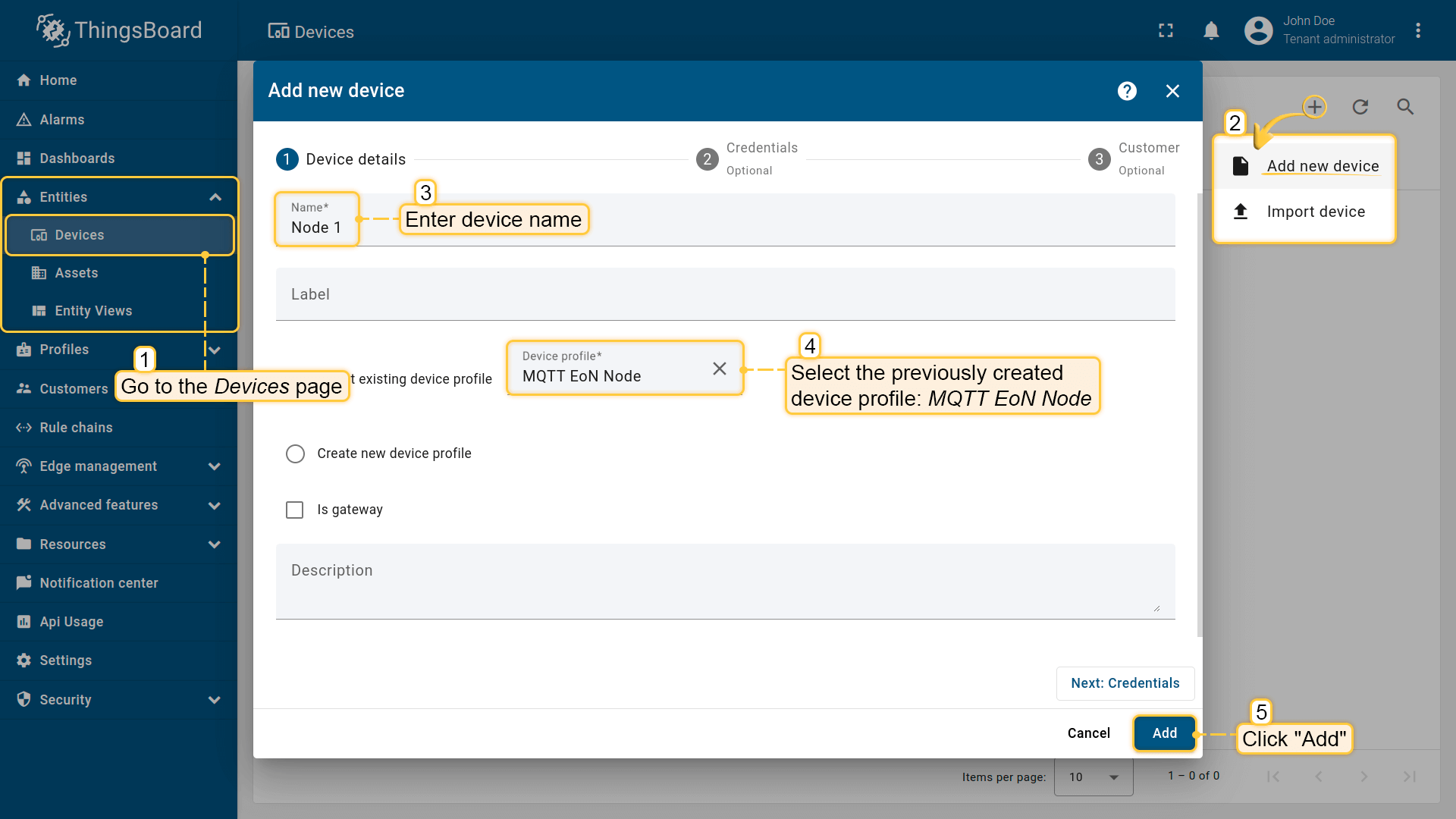 - 输入EoN节点设备名称(如Node 1)并选择现有设备配置:MQTT EoN Node。