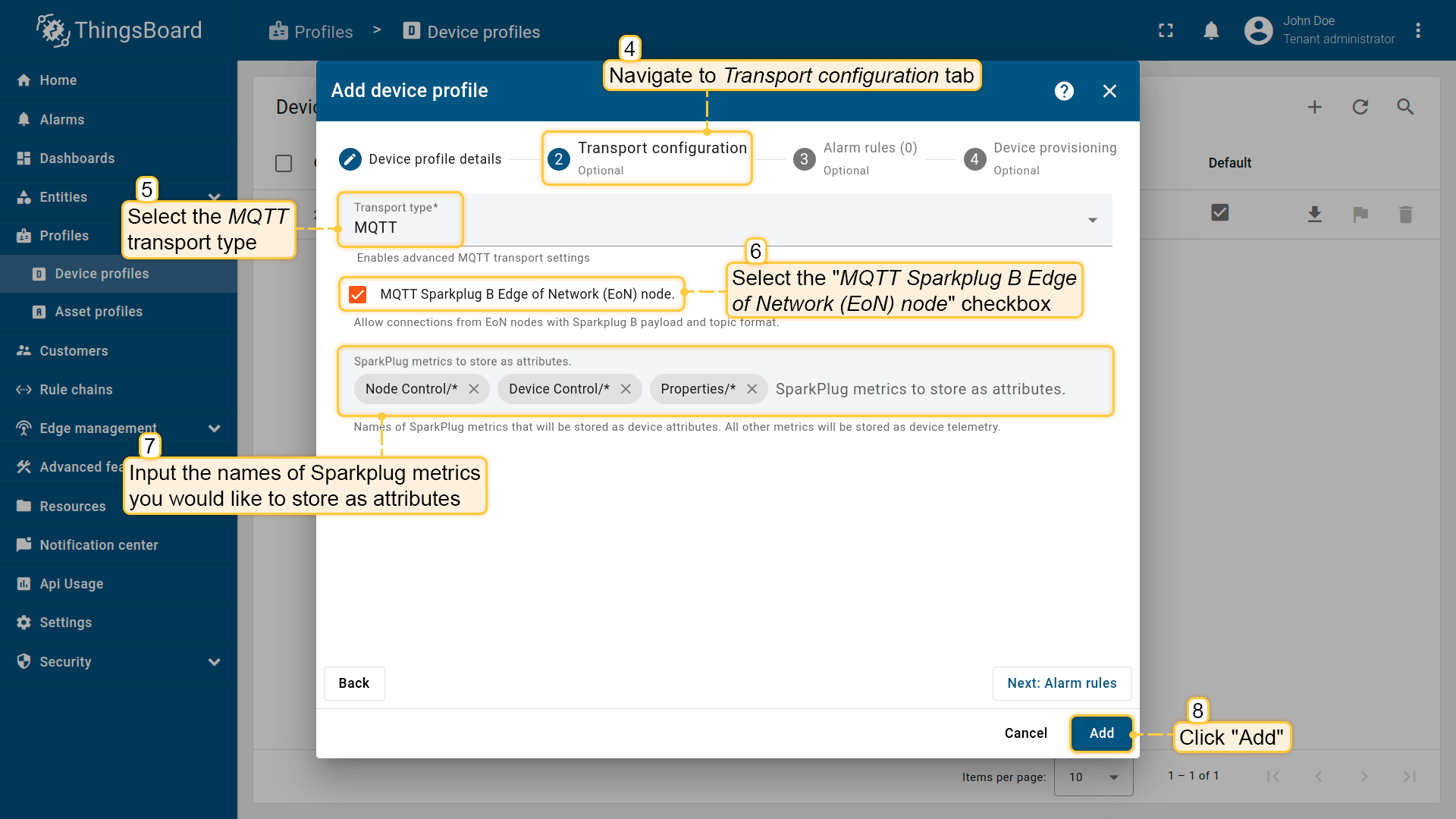 ThingsBoard充当MQTT服务器,支持SparkPlug负载和主题结构,并允许来自MQTT网络边缘(EoN)节点的连接。