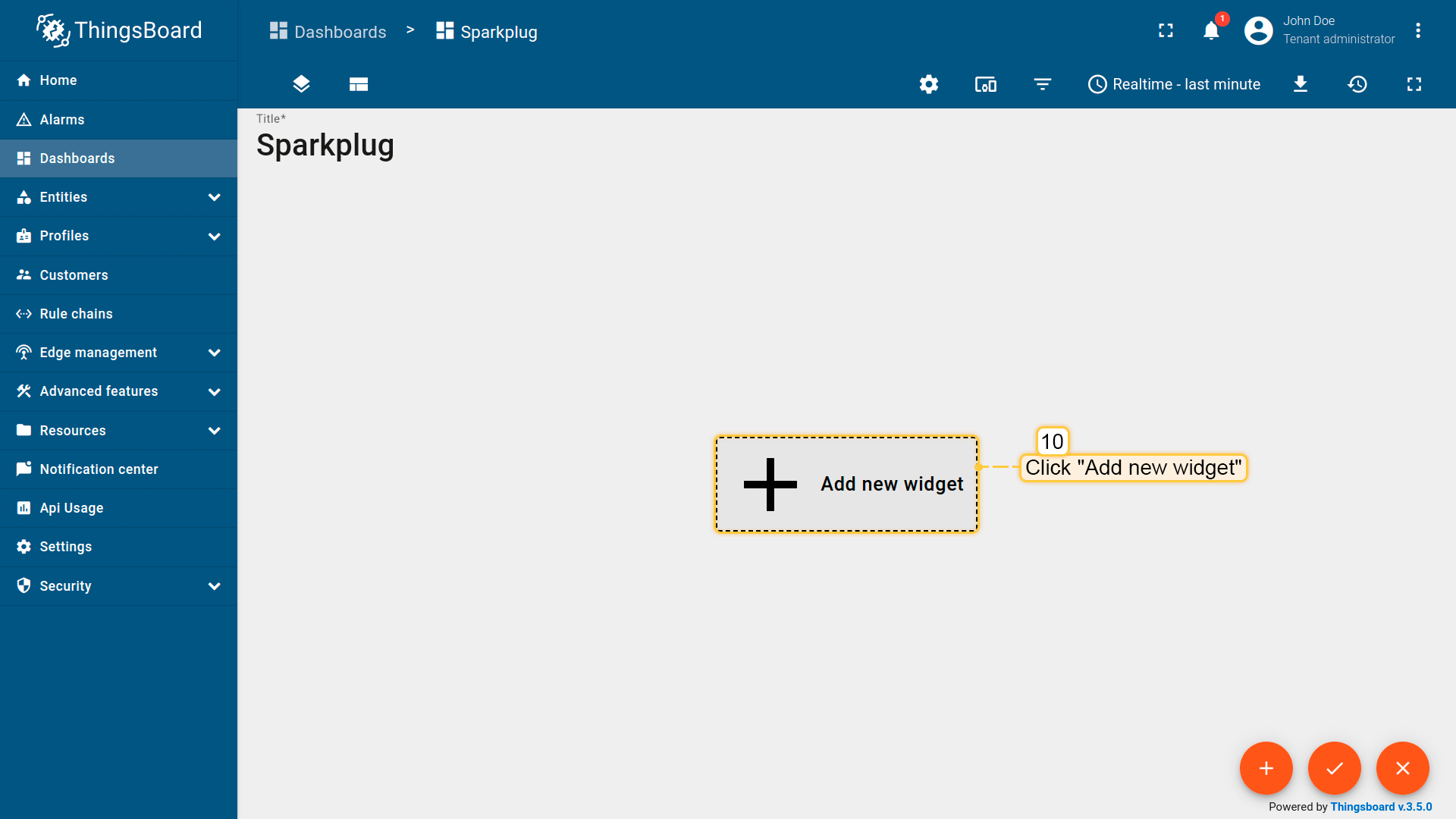 进入仪表板页面并创建名为Sparkplug的新仪表板。打开仪表板,点击实体别名图标添加新别名。 命名别名(例如EoN Node),选择筛选类型”单个实体“,类型”设备“并选择Node 1。点击添加然后保存。