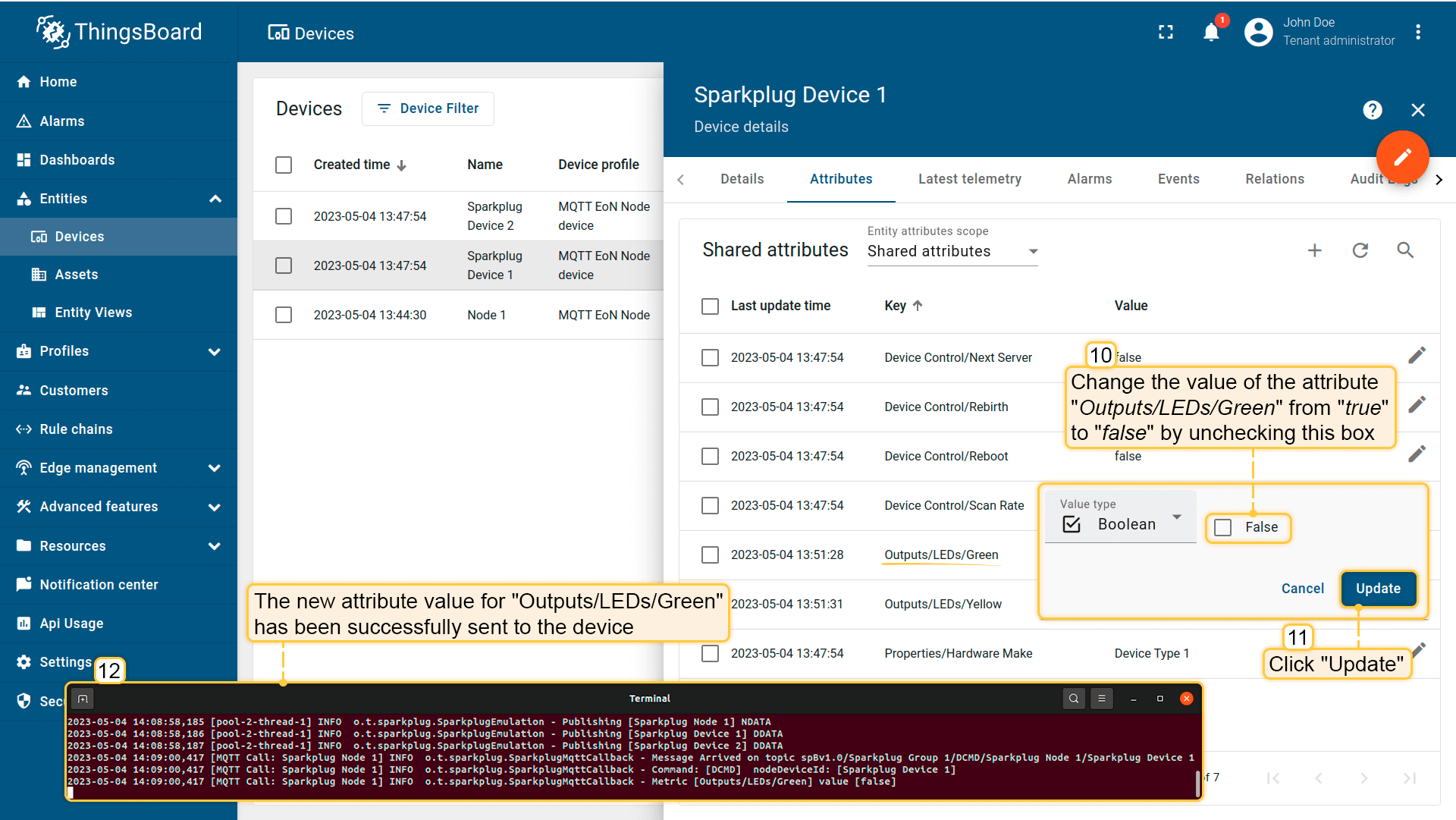 点击”铅笔”图标,取消勾选对应复选框,将属性”Outputs/LEDs/Green“的值从”true”改为”false”。然后点击更新。名为”Outputs/LEDs/Green“、值为”false“的属性将从服务器发送至设备”Sparkplug Device 1“。